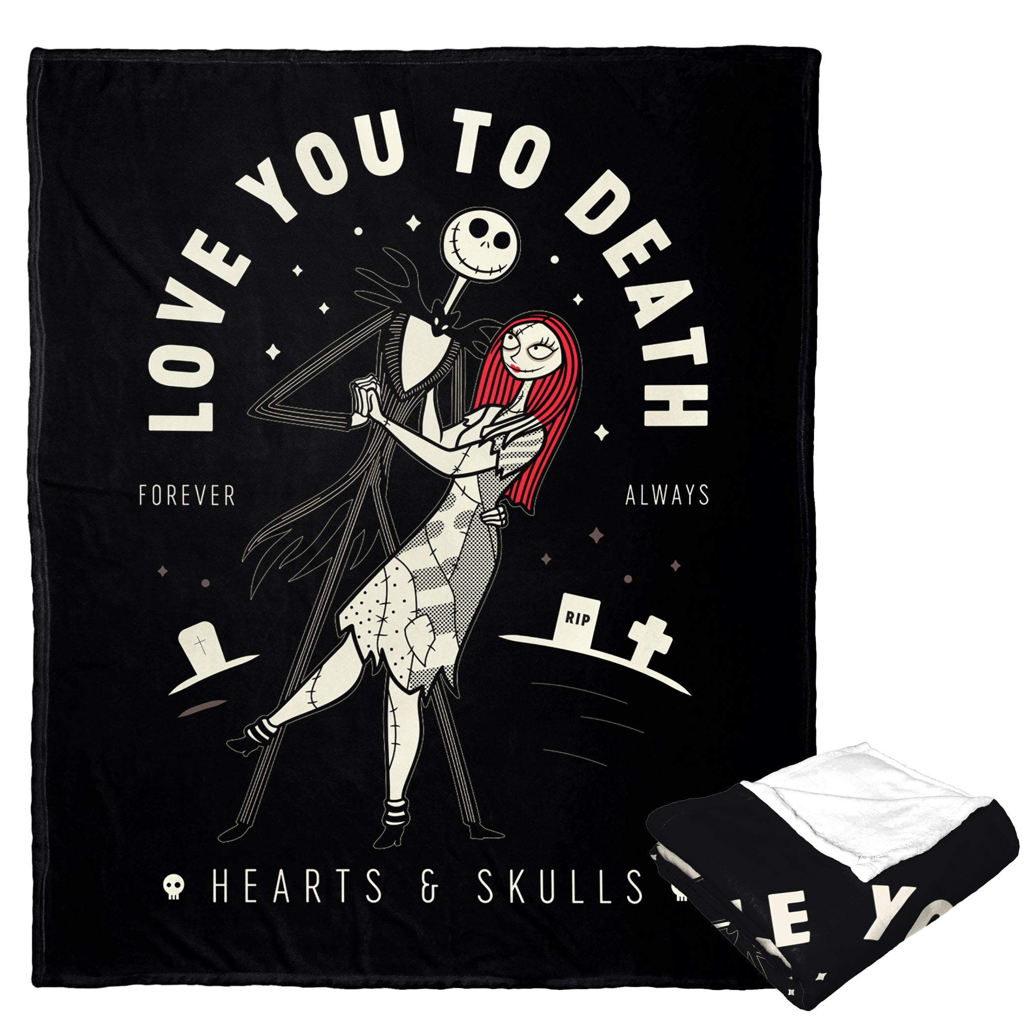 Elevate your love story with a touch of dark romance with our Nightmare Before Christmas ""Love Till Death"" Personalized Silk Touch Throw Blanket. Add a touch of dark, romantic charm to any room. Whether draped over the sofa, spread across your favorite chair, or used as an extra layer on your bed, it transforms your space into a hauntingly beautiful sanctuary. Celebrate your love in Burton-esque style, and let your heart and home be forever intertwined!