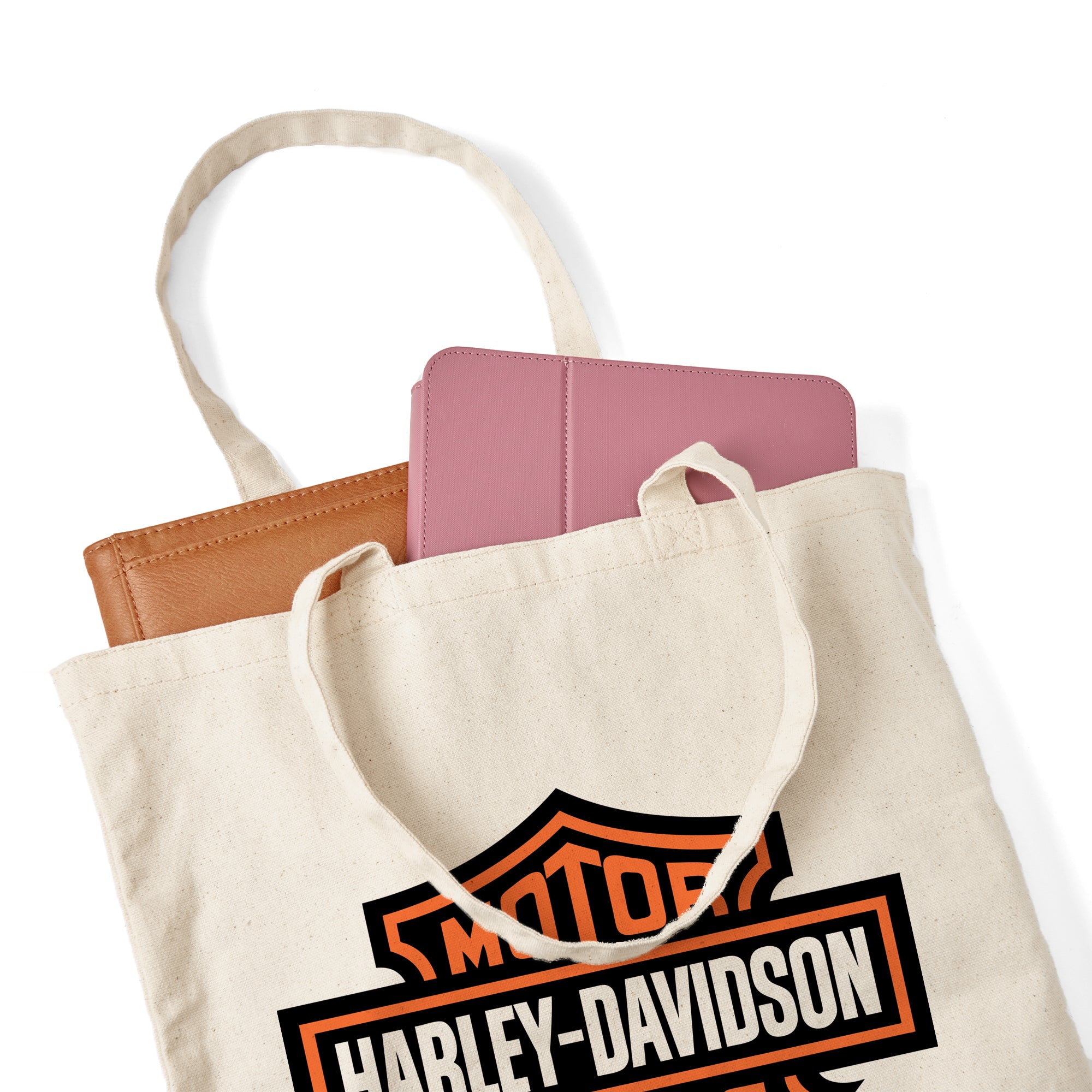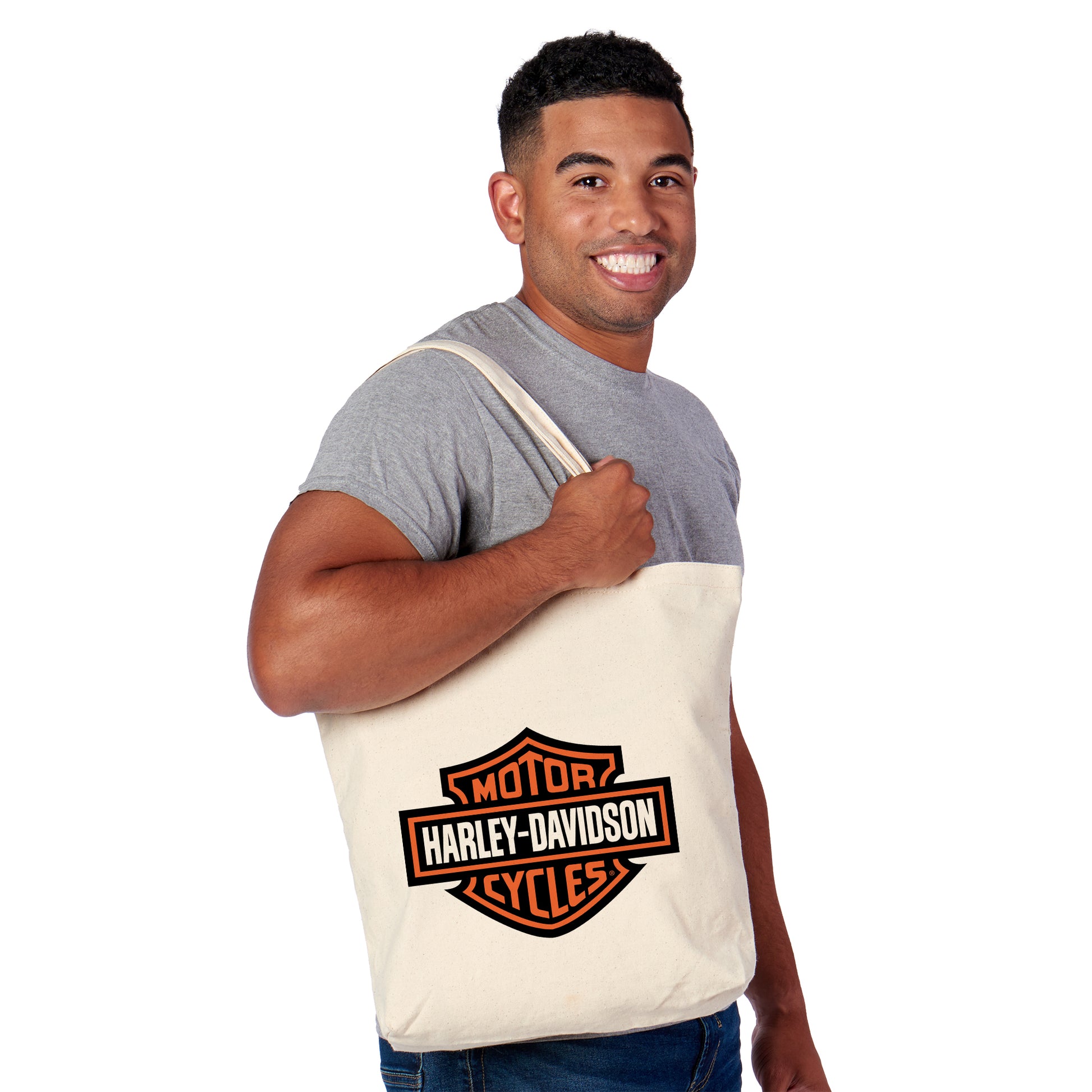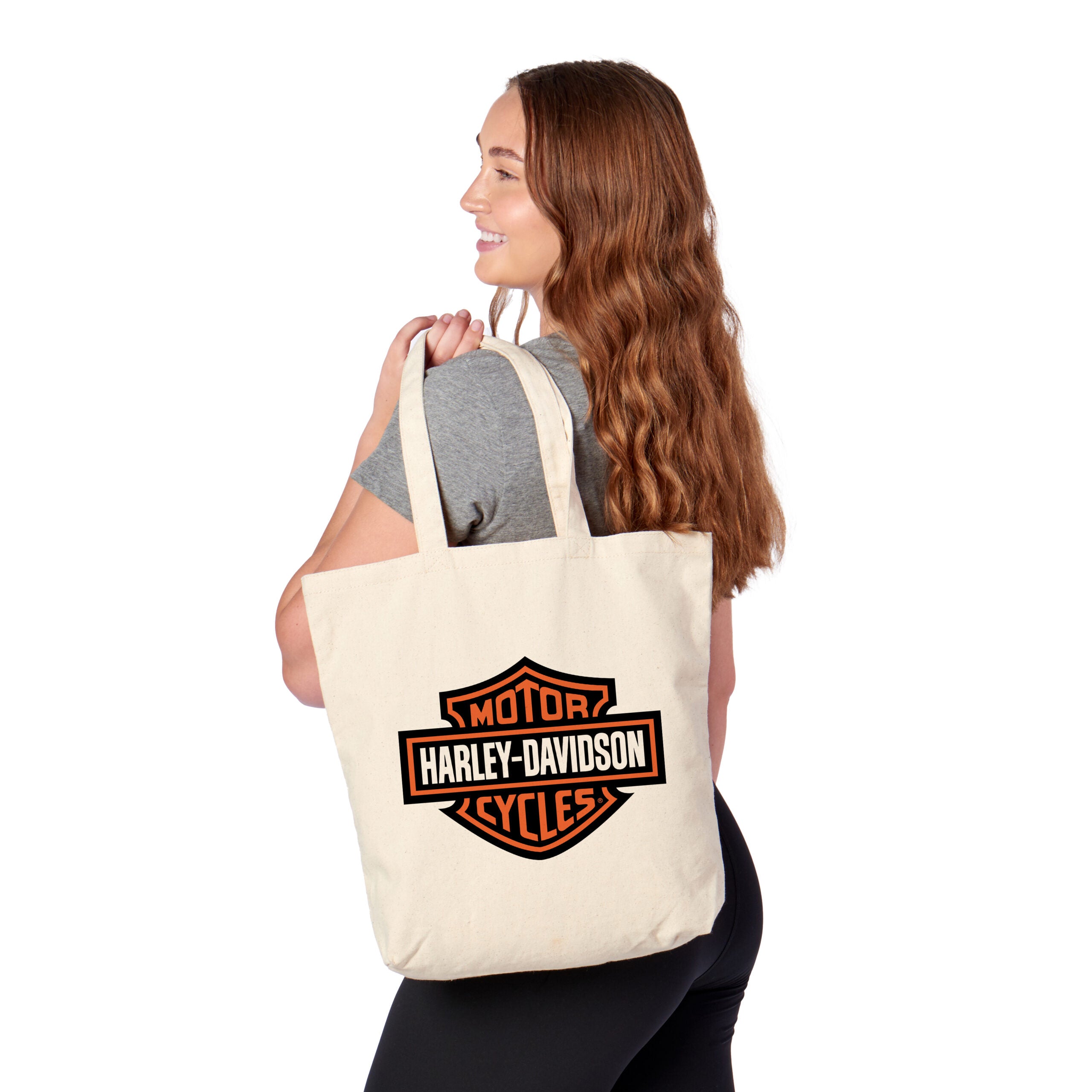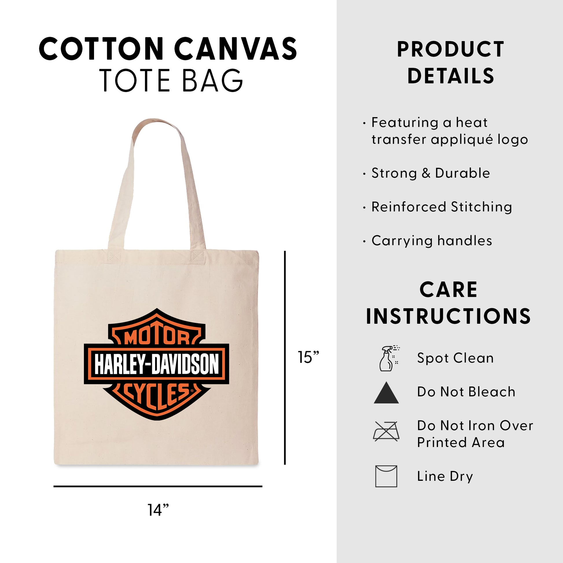 Blend everyday function with timeless motorcycle heritage style with the Harley-Davidson Classic Logo 14" Canvas Tote. Crafted from strong and durable cotton canvas, it maintains a clean, structured shape while offering dependable support for carrying daily essentials. Measuring 14" wide by 15" high, the spacious open interior easily accommodates groceries, books, personal gear, or travel necessities. Reinforced stitching and sturdy shoulder straps provide comfortable carrying and long-lasting performance for repeated use. Finished with a bold heat transfer appliqué of the iconic Harley-Davidson Bar & Shield logo, this tote makes a confident statement of rider pride. Practical, versatile, and easy to care for with simple spot cleaning and line drying, its a reliable accessory for enthusiasts who value both function and unmistakable style.