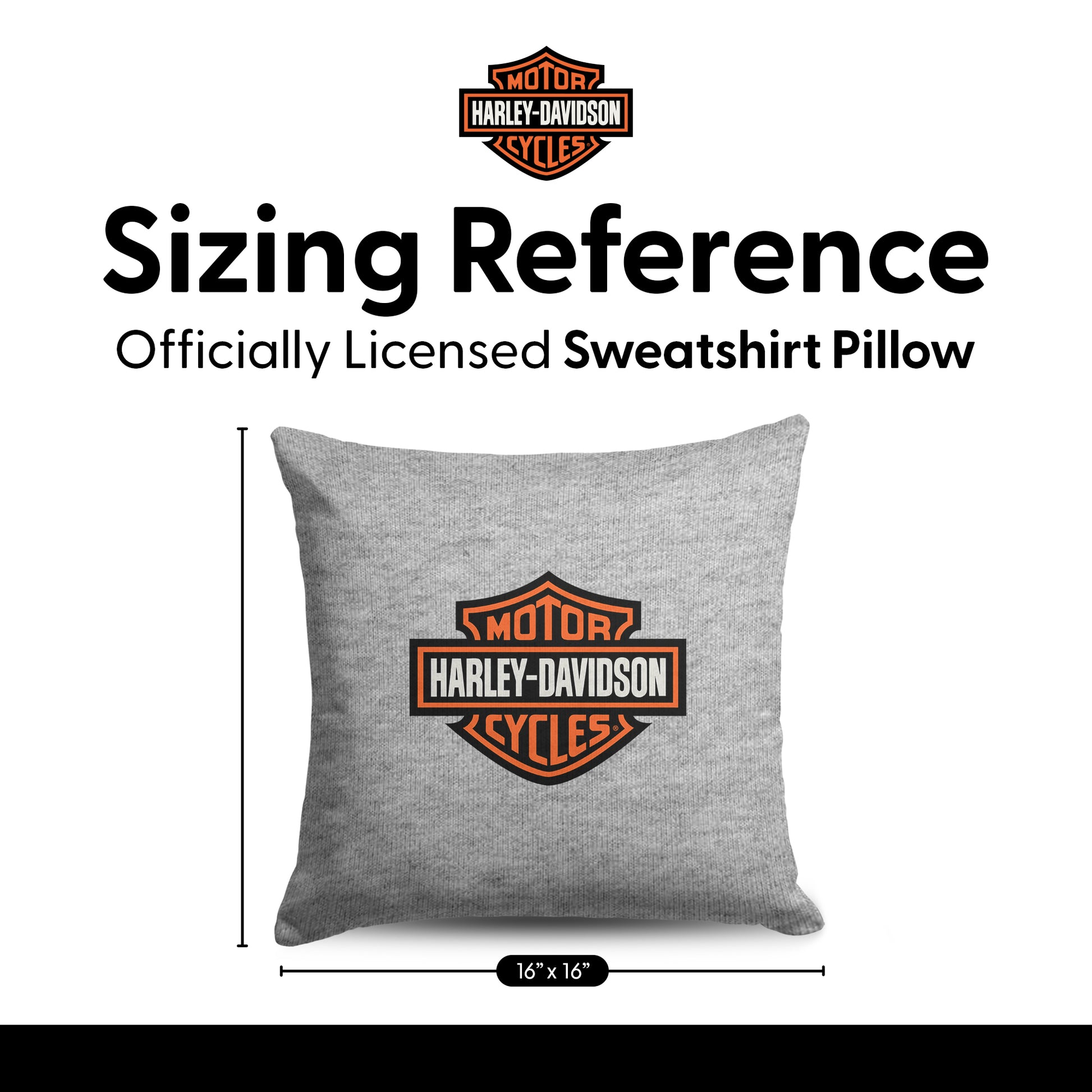 The Harley-Davidson Classic Logo 16" Sweatshirt Pillow combines everyday comfort with timeless style. Made with soft, sweatshirt-inspired fabric, it delivers a cozy, relaxed feel while providing dependable cushioning for couches, beds, chairs, or office seating. The durable material offers stretch and resilience, helping the pillow maintain its shape and comfort through regular use. Featuring the iconic Harley-Davidson Bar & Shield logo centered on the front, it adds a bold rider-inspired accent that complements a variety of décor styles. Measuring 16" x 16", its versatile square size makes it easy to layer with other pillows for a comfortable, styled look. Easy to care for and built for everyday enjoyment, this pillow is a great addition to fan spaces and a thoughtful gift for Harley-Davidson enthusiasts.