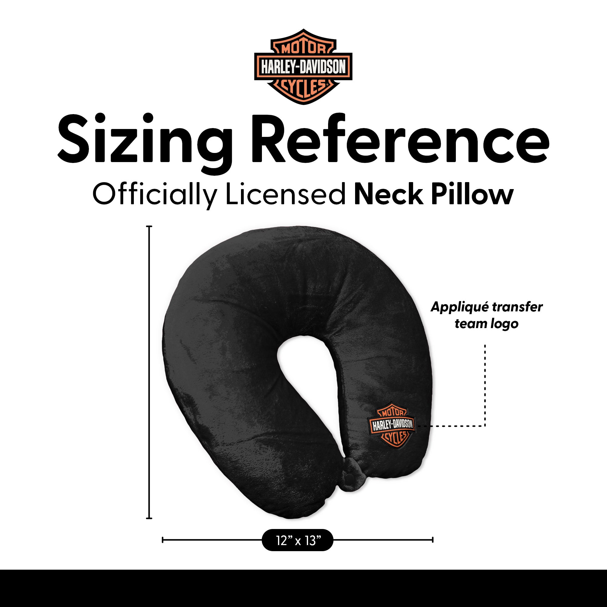 The Harley-Davidson Classic Logo Neck Pillow delivers travel-ready comfort with unmistakable motorcycle heritage style. Designed in an ergonomic wrap-around U-shape, it gently cradles the neck and head to promote comfortable positioning during long rides, road trips, flights, or relaxing at home. Soft, cushioned materials provide a plush feel while maintaining supportive structure for dependable everyday use. Measuring 12" x 13", its compact size makes it easy to pack in luggage, store in vehicles, or keep close by in seating areas. An appliqué transfer Harley-Davidson Bar & Shield logo adds a bold rider-inspired accent against the sleek black design. Easy to maintain with simple spot cleaning, this neck pillow is a practical and stylish accessory for fans who value comfort and classic Harley-Davidson identity.