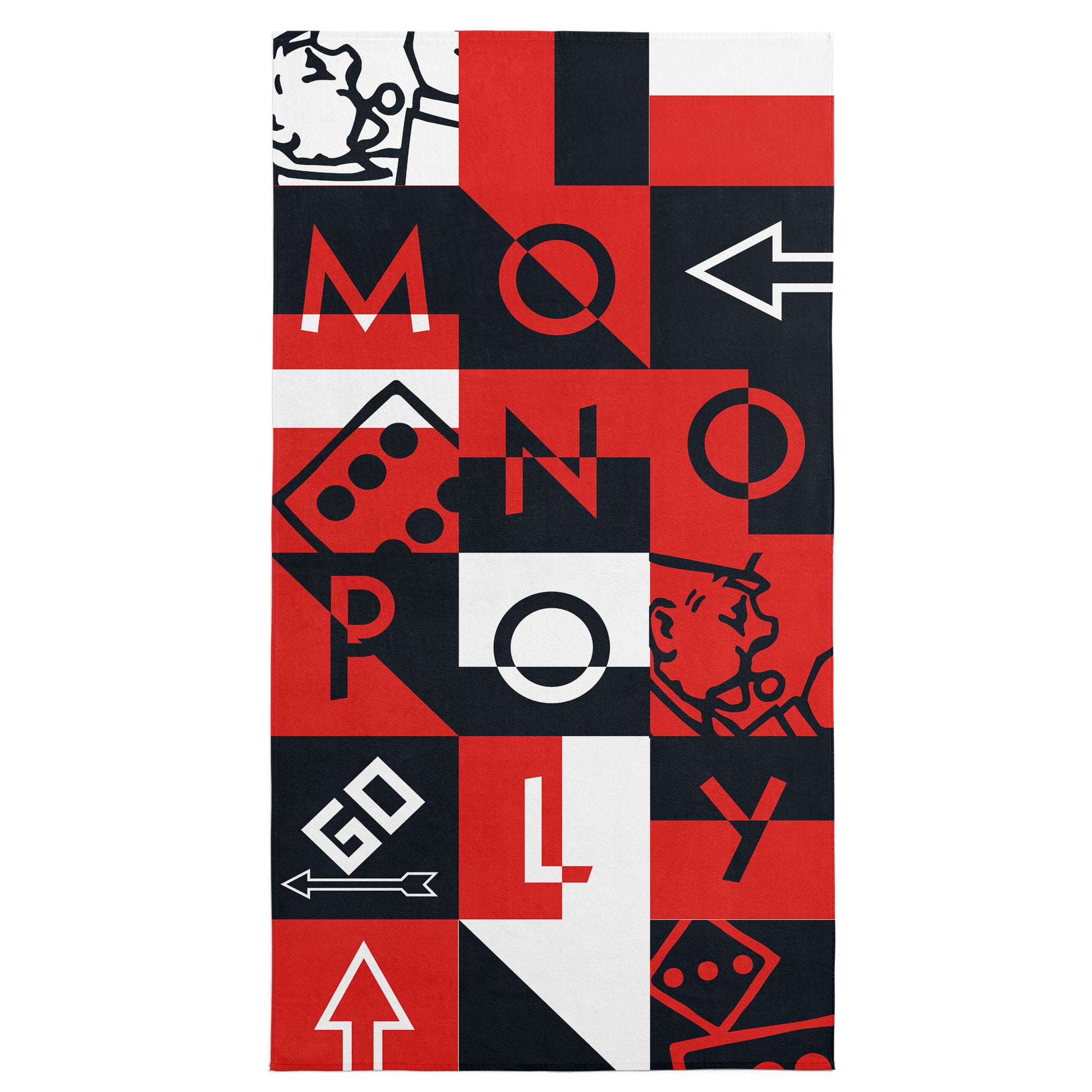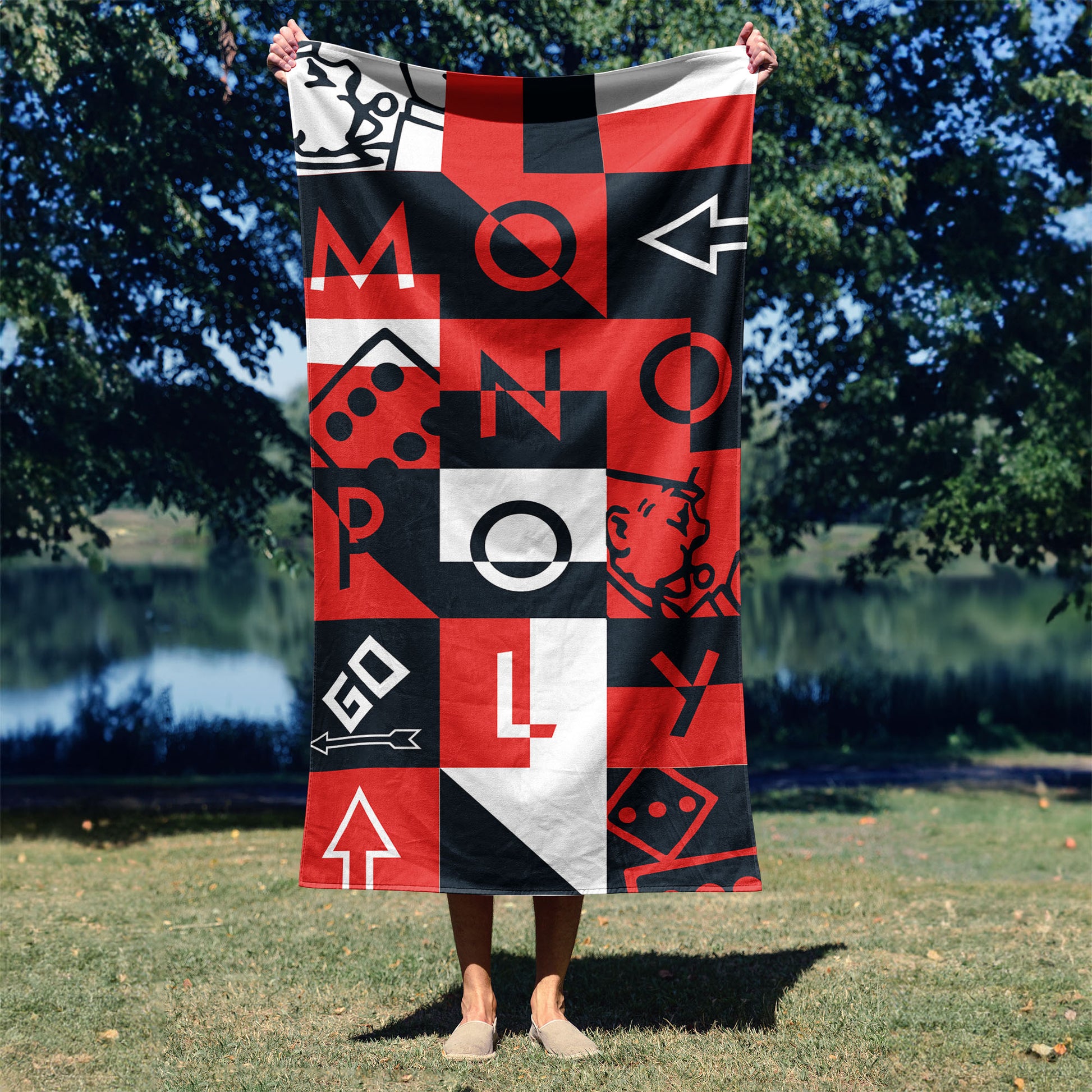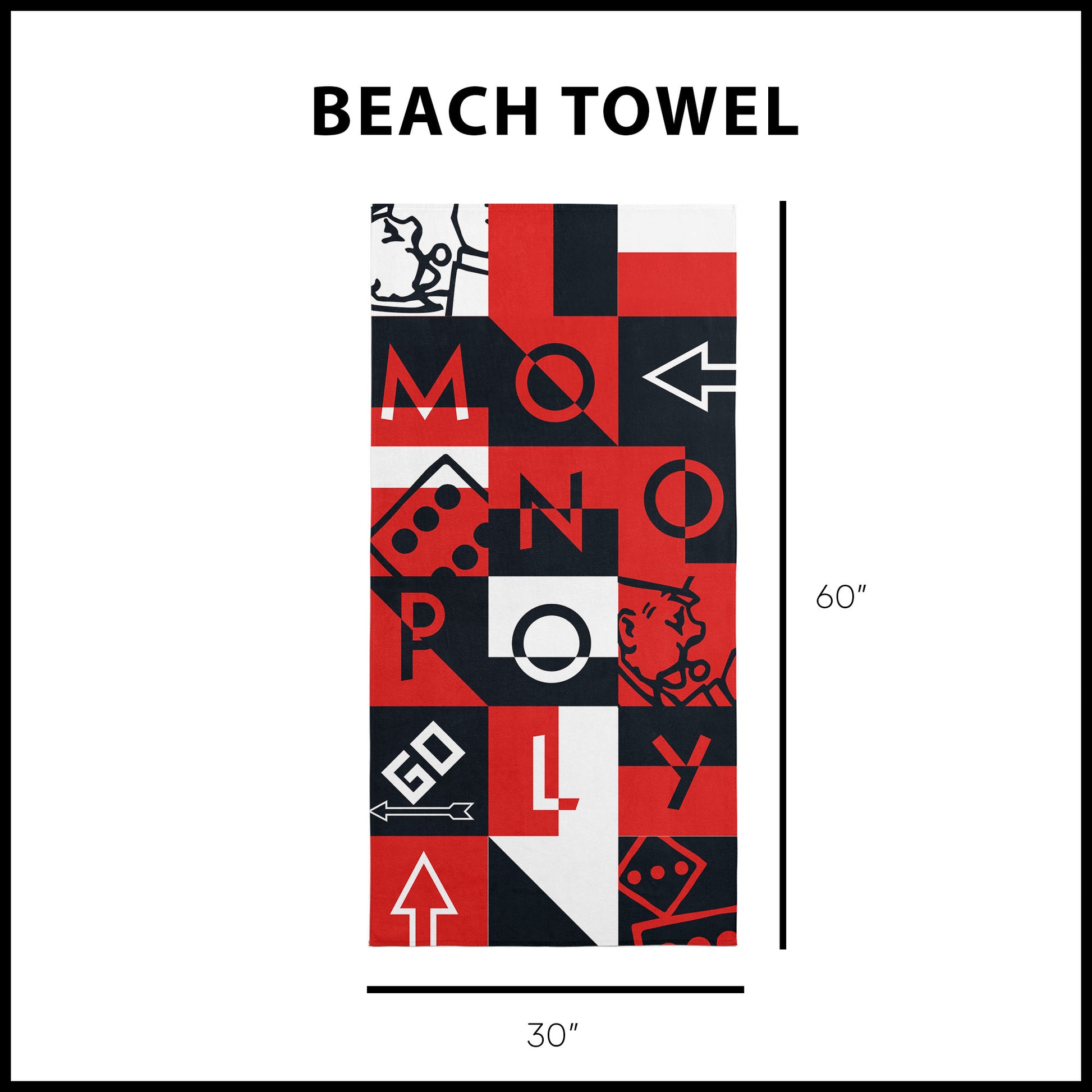 Bold, modern, and unmistakably classic, the Officially Licensed Monopoly Color Block Microfiber Beach Towel features a striking red, black, and white geometric layout accented with Monopoly icons—including dice, arrows, the GO space, and Mr. Monopoly himself. Crafted from soft, lightweight microfiber, it’s fast-drying, sand-resistant, and easy to roll up for beach trips, poolside lounging, or vacations. A stylish pick for board-game lovers, offering cozy comfort and everyday durability. Makes a fun, standout gift for Monopoly fans who appreciate a fresh, graphic twist on a timeless favorite.