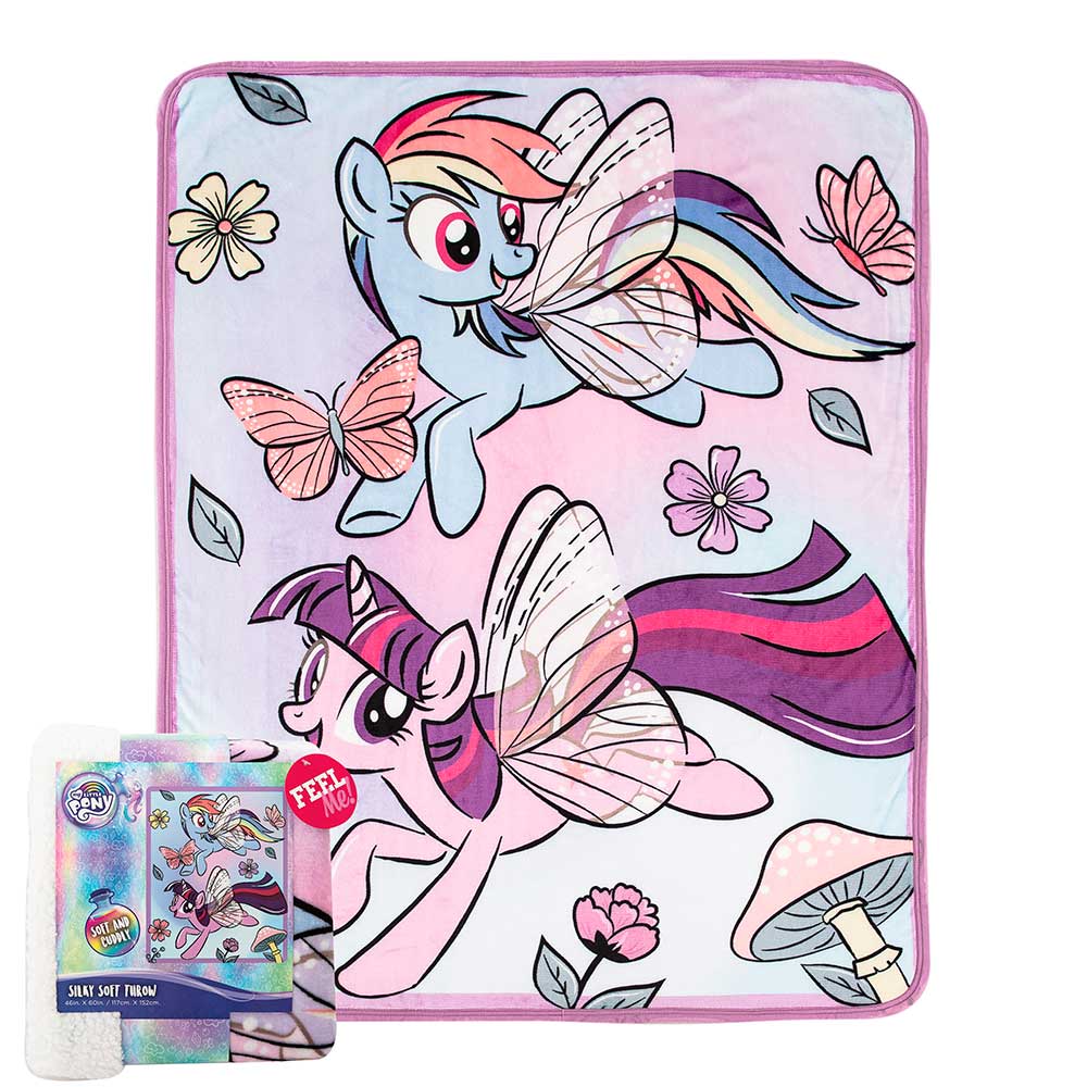Keep warm with Hasbro's My Little Pony "Floral Flight" Silk Touch Sherpa Throw Blanket by TheNorthwest. This throw blanket is the perfect accessory for your couch or bedroom. This 40"x 50" throw features Rainbow Dash and Twilight Sparkle surrounded by butterflies and flowers. This throw blanket is made with a super soft, silk touch fabric front and a plush, neutral color sherpa back and decorative binding around all edges.