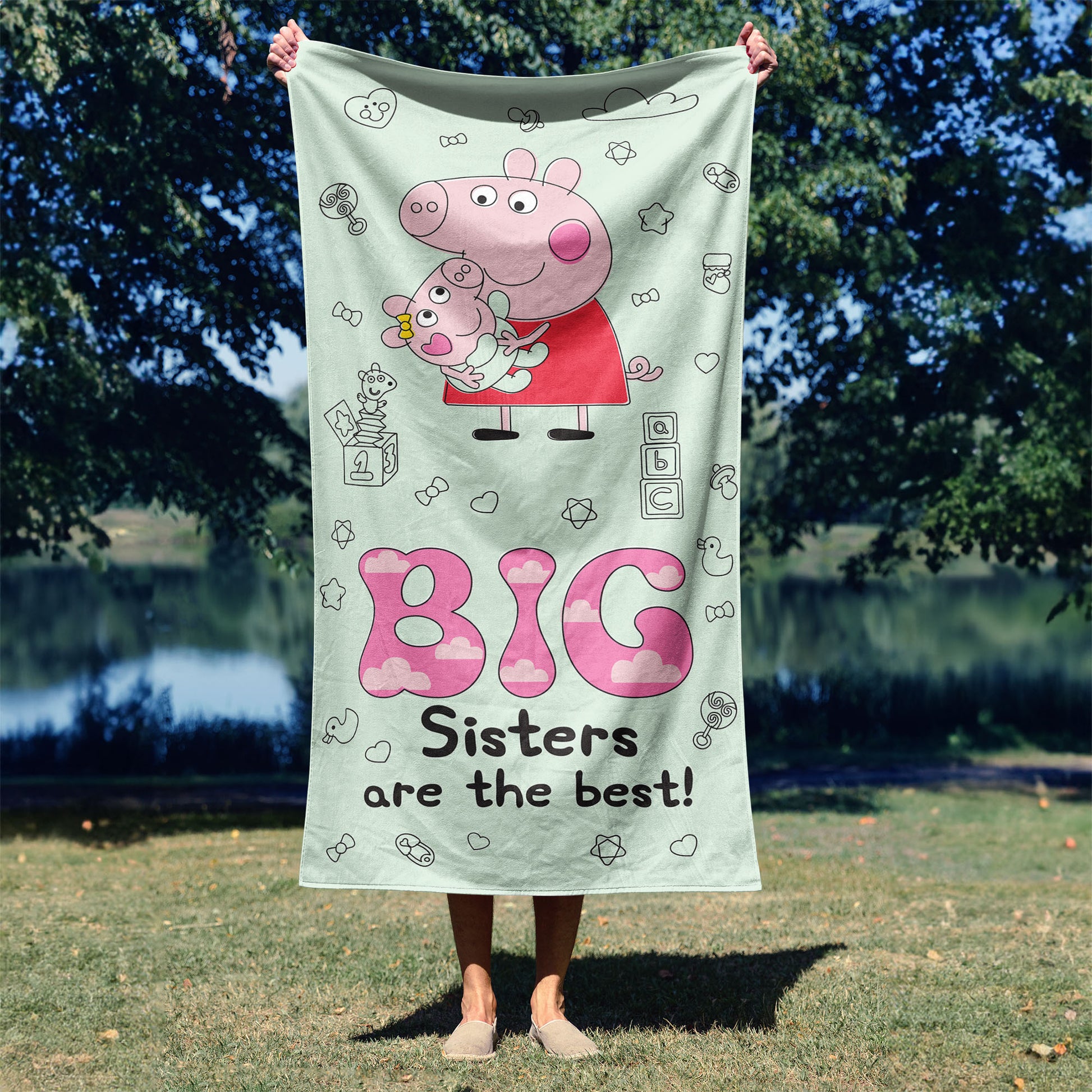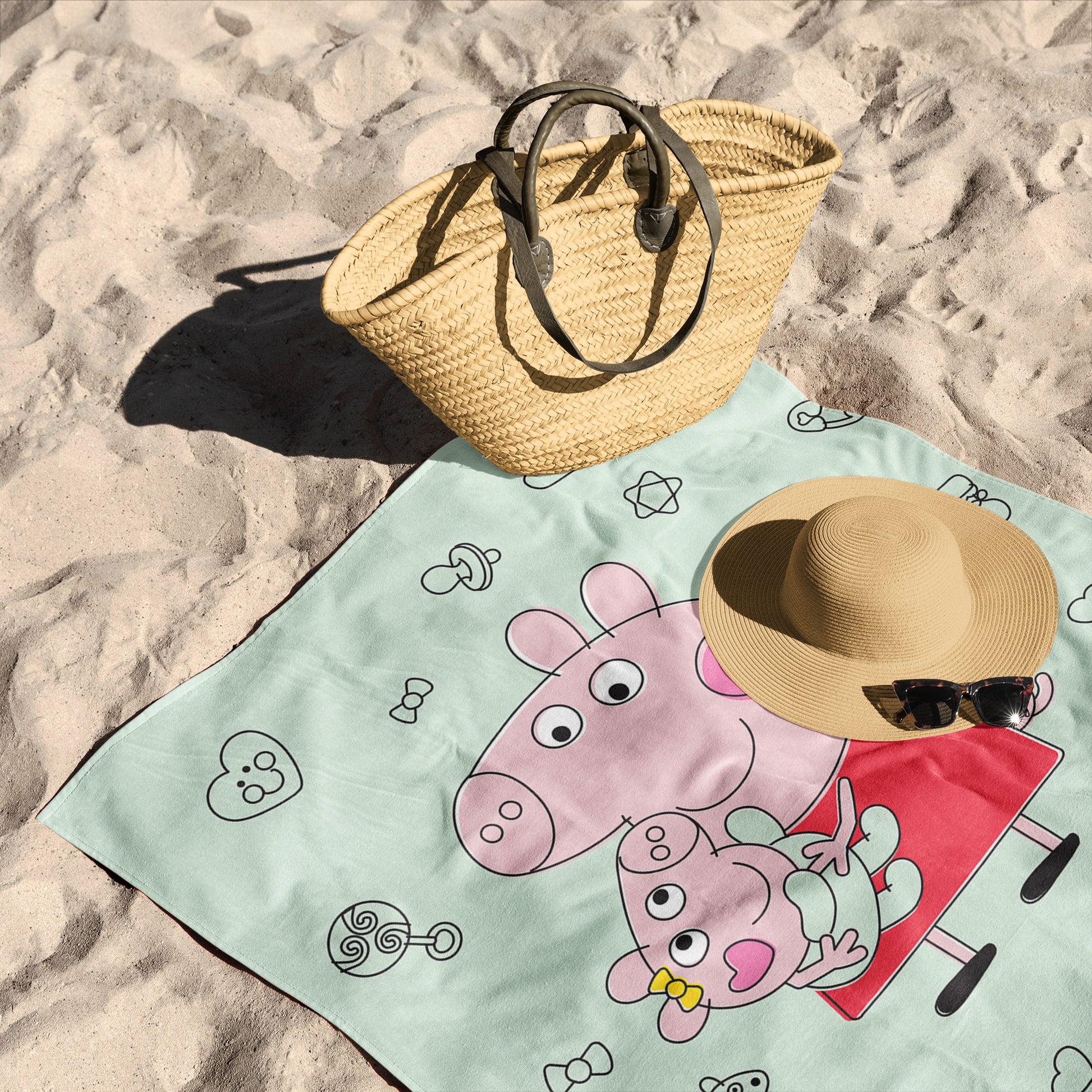 Sweet, playful, and perfect for little Peppa fans, the Officially Licensed Peppa Pig Big Sisters Microfiber Beach Towel features an adorable scene of Peppa holding Baby Alexander, surrounded by cute doodles like hearts, stars, blocks, toys, and rubber duckies. Made from soft, lightweight microfiber, it’s fast-drying, sand-resistant, and easy to pack for beach days, pool fun, or family adventures. A heartwarming pick for proud big sisters and Peppa lovers alike, offering cozy comfort and cheerful style. Makes a delightful gift that celebrates sibling pride all summer long.