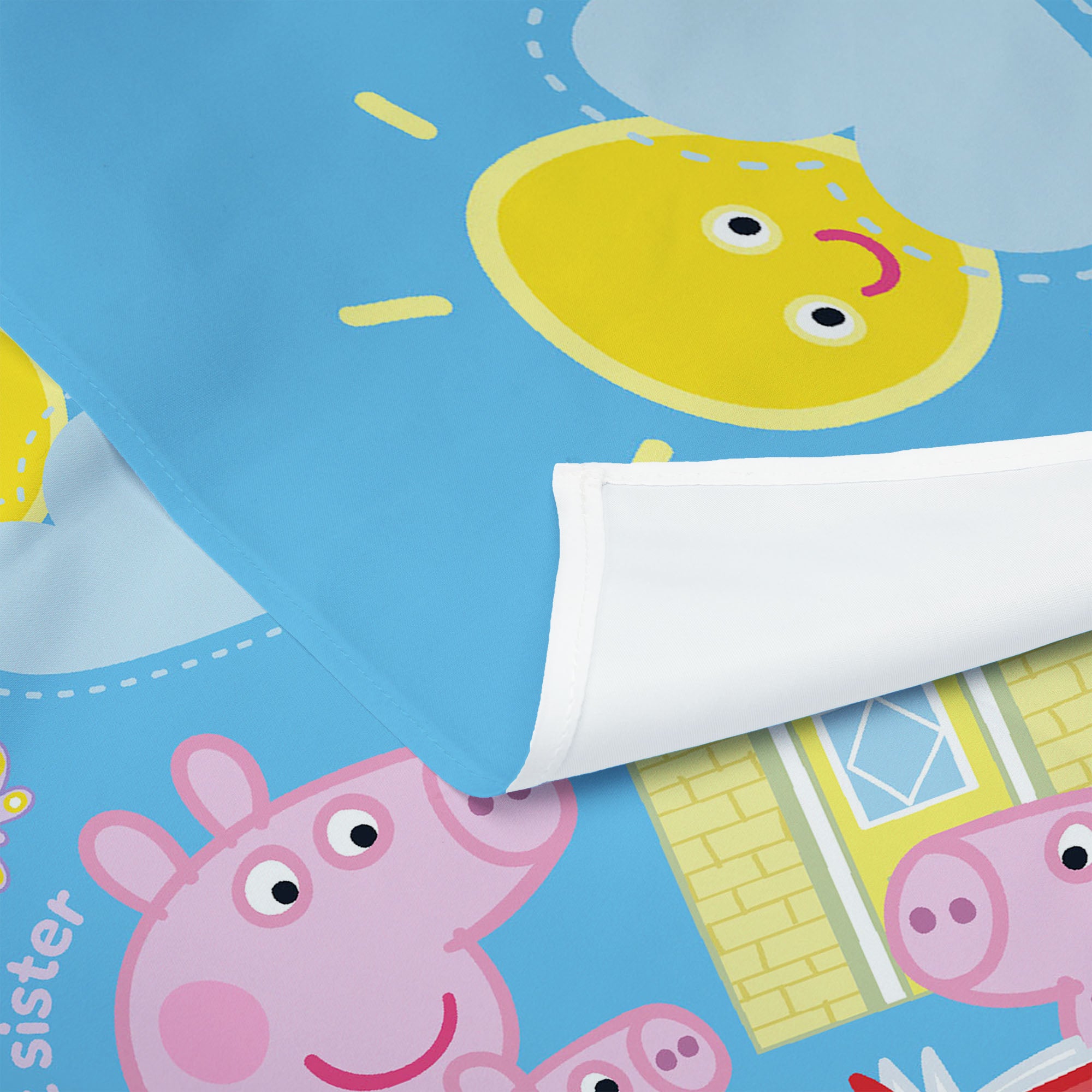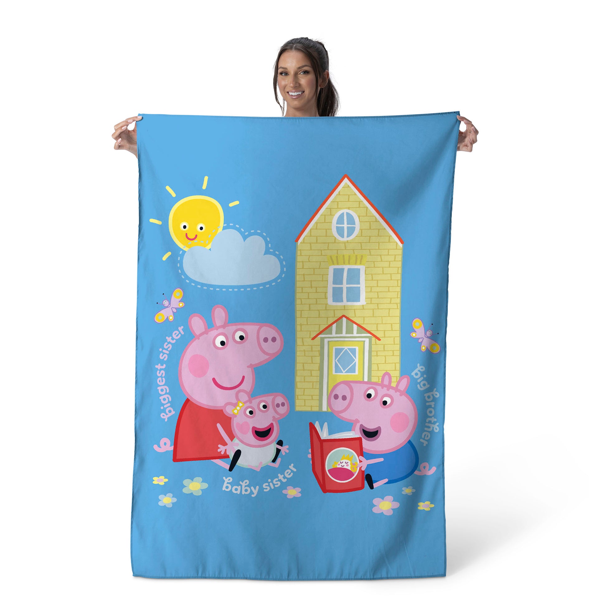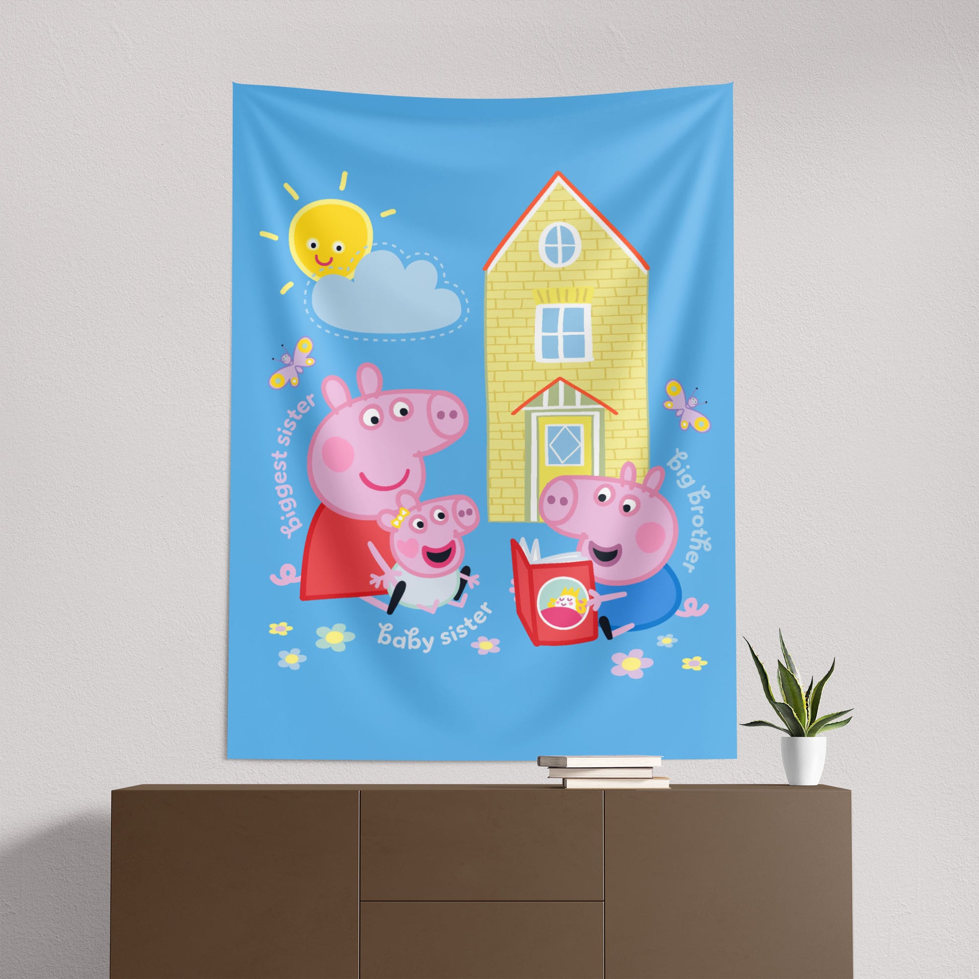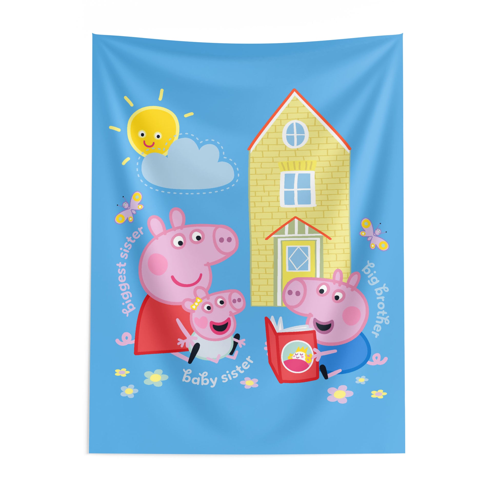 Brighten up any space with the Officially Licensed Peppa Pig Sibling Time Together Wall Hanging! Featuring Peppa, George, and their baby sister enjoying a sweet family moment outside their house, this cheerful scene brings warmth and positivity to your child’s room. A wonderful gift for Peppa Pig fans, this wall hanging is perfect for adding a pop of color to bedrooms, nurseries, and playrooms. Lightweight and easy to display, it creates an inviting backdrop for story time, playtime, or everyday smiles—making any space feel a little more joyful and full of Peppa-style fun.