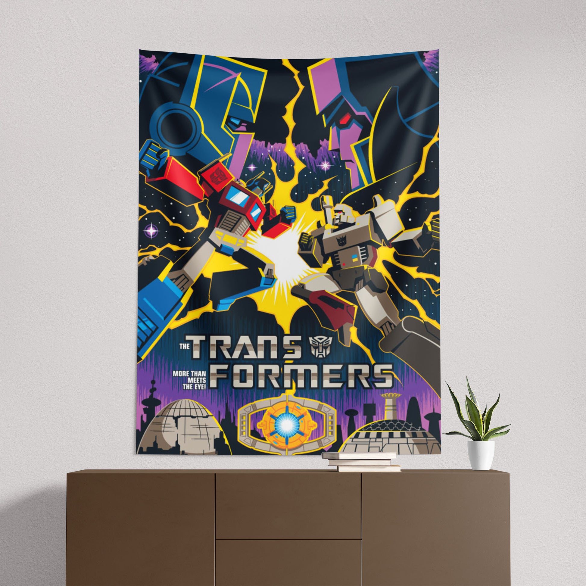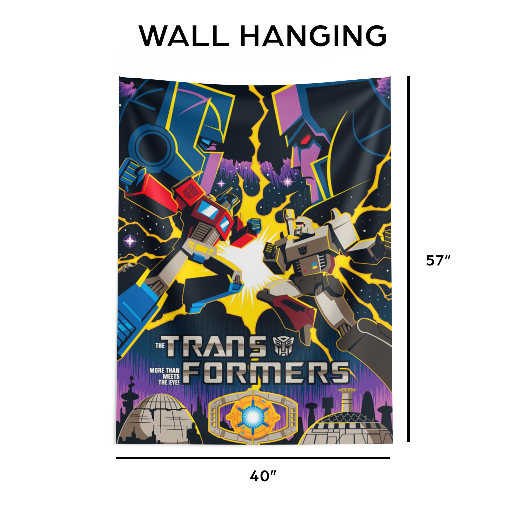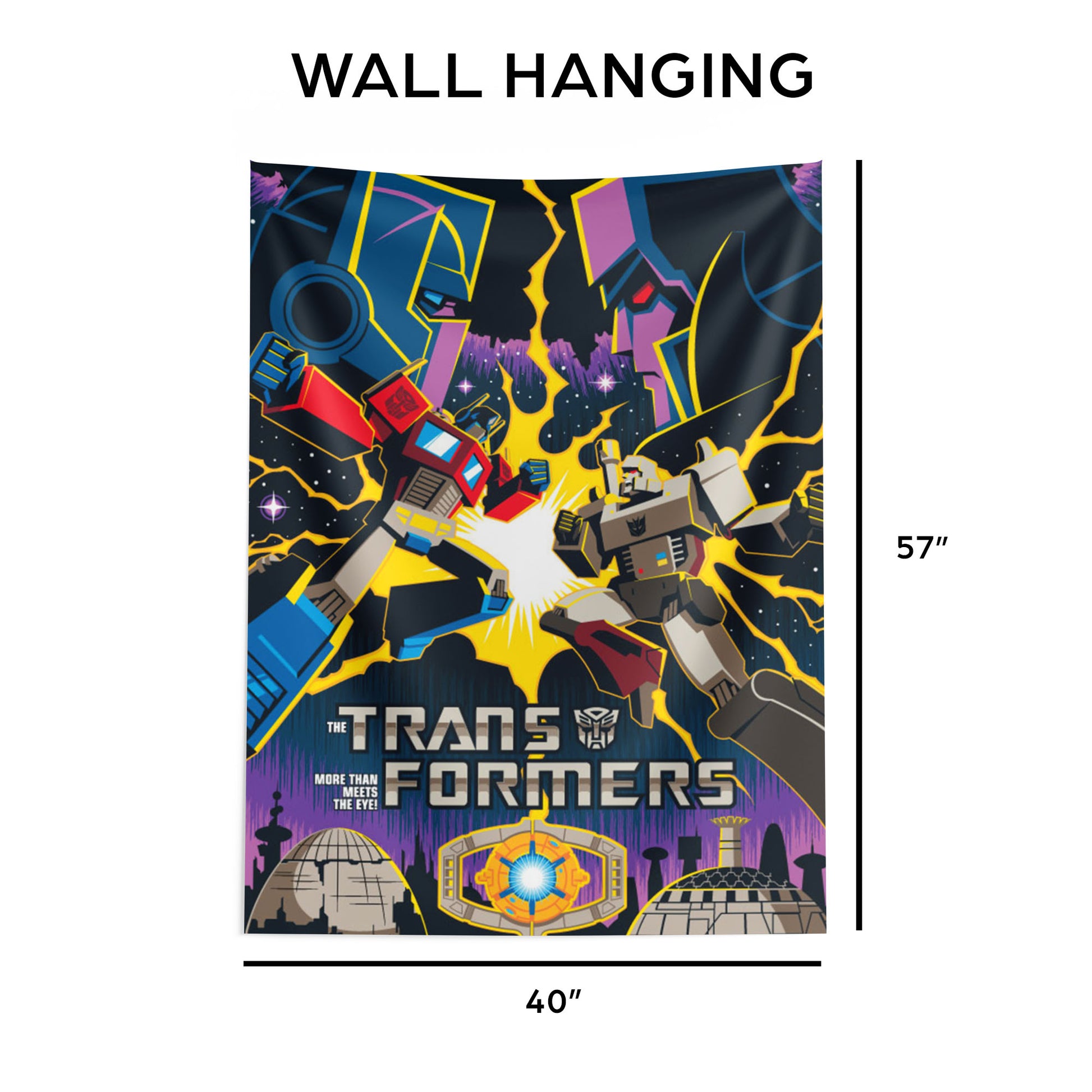 Gear up your space with high-energy retro style courtesy of the Officially Licensed Transformers Gen 1 Meets The Eye Wall Hanging! Bursting with bold color and vintage comic flair, this dynamic artwork showcases the ultimate showdown between Optimus Prime and Megatron, surrounded by crackling energy, cosmic skies, and classic Transformers iconography. A powerful gift for longtime fans and collectors, this lightweight wall hanging is perfect for adding nostalgia and action to bedrooms, game rooms, offices, or fan caves. Easy to display and impossible to ignore, it brings the epic spirit of Generation 1 Transformers straight to your walls—more than meets the eye, indeed.