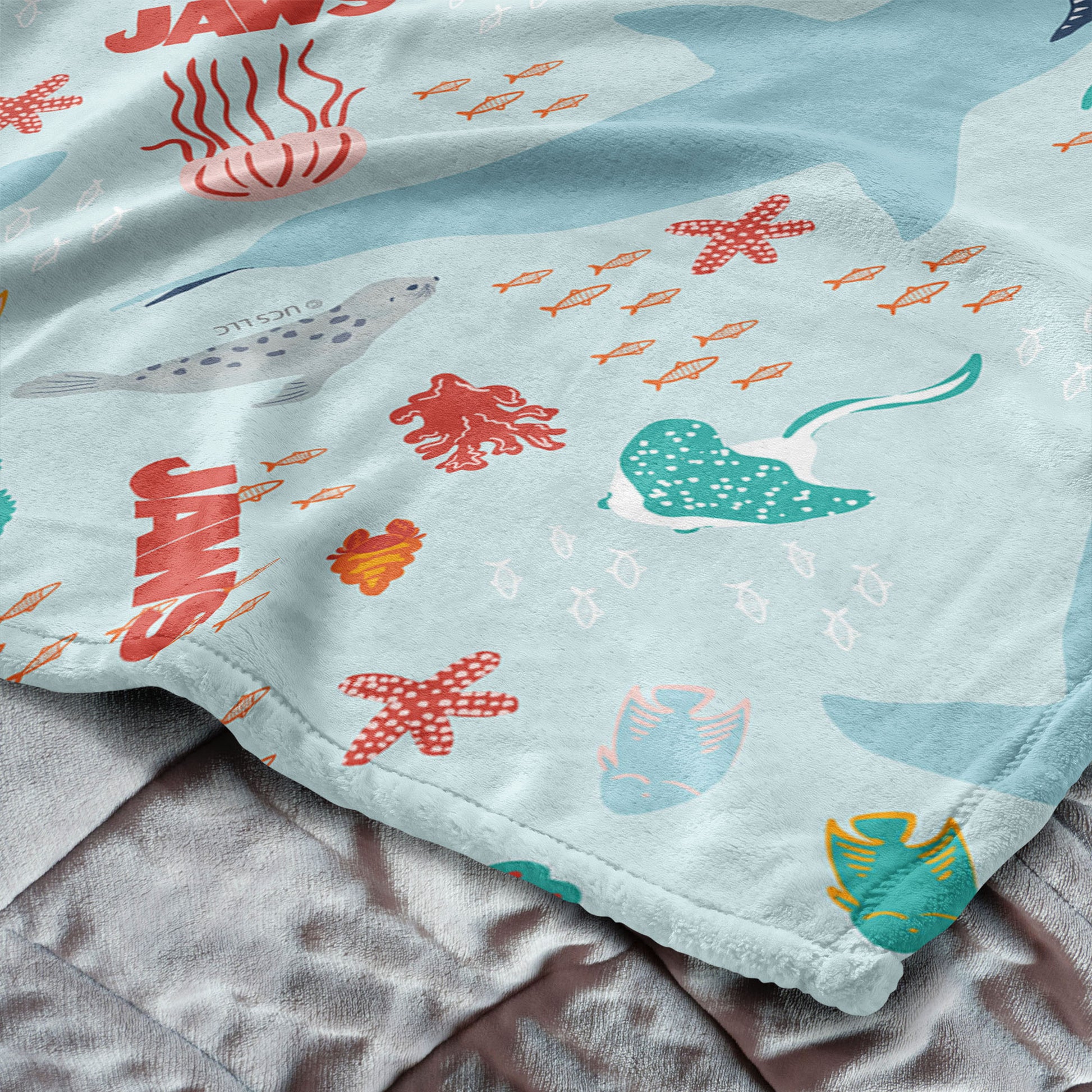 Dive into ocean vibes with the Universal Jaws “Coastal Sharks” Silk Touch Throw Blanket, featuring a playful repeating pattern of sharks, seals, jellyfish, coral, and the iconic Jaws logo. Made with ultra-soft, velvety fabric, it’s perfect for adding a splash of seaside fun to your movie nights or cozy afternoons. Fans of the classic thriller will love how this blanket mixes lighthearted coastal elements with a nod to their favorite shark movie. Lightweight yet plush, it’s easy to toss on a couch, bed, or lounge chair for instant comfort and character. Whether you’re gifting it to a fellow fan or keeping it all to yourself, this throw adds a pop of underwater adventure to any space. Snuggle up and show your love for sun, surf, and sharks with a blanket that’s as soft as it is fun.