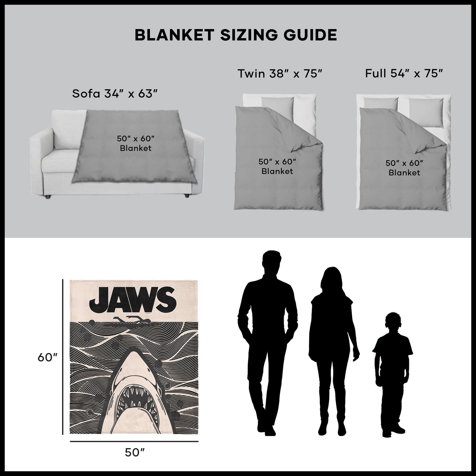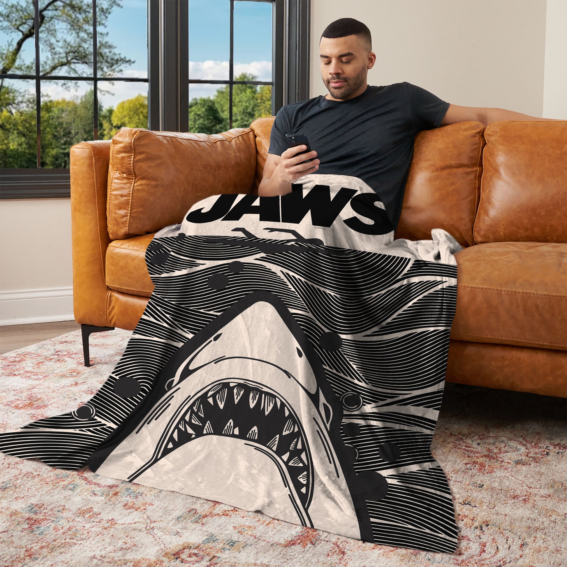 Make a bold statement on movie night with the Universal Jaws “Duotone Poster” Silk Touch Throw Blanket, featuring a dramatic black-and-cream design of the iconic shark and swimmer in a striking wave pattern. Made with ultra-soft, velvety fabric, it brings graphic style and cozy comfort to any fan’s space. Fans of the legendary thriller will love how the duotone artwork gives a modern twist to a timeless classic. Lightweight yet plush, it’s perfect for draping over a couch, bed, or chair for an instant pop of suspenseful character. Ideal for gifting or keeping all to yourself, this blanket lets you wrap up in comfort while paying tribute to one of cinema’s most unforgettable moments. Snuggle in and relive the chills of Jaws with every cozy night in.