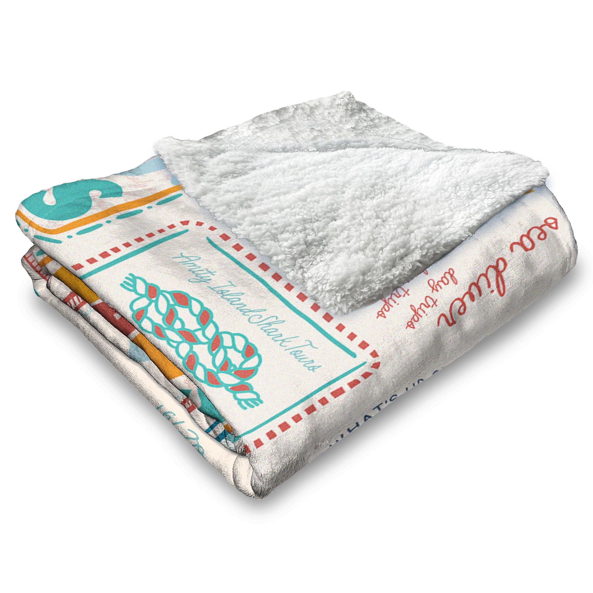 Send cozy vibes with the Universal Jaws "Jaws Post Stamps" Silk Touch Sherpa Throw Blanket, featuring a playful repeating pattern of vintage-inspired stamps, seaside icons, and classic shark graphics. Made with ultra-soft, velvety fabric, it's the perfect blend of retro charm and movie nostalgia for fans of the iconic thriller. From ice cream cones and lifeguard cars to surfboards and sharks, every detail adds a touch of vacation fun and coastal adventure to your space. Lightweight yet plush, it's great for draping over your bed, couch, or favorite chair for a splash of personality. Perfect for gifting or keeping all to yourself, this blanket brings comfort and character together in one super-soft package. Wrap up, get cozy, and relive the timeless thrills of Jaws in a style that's as fun as it is relaxing.