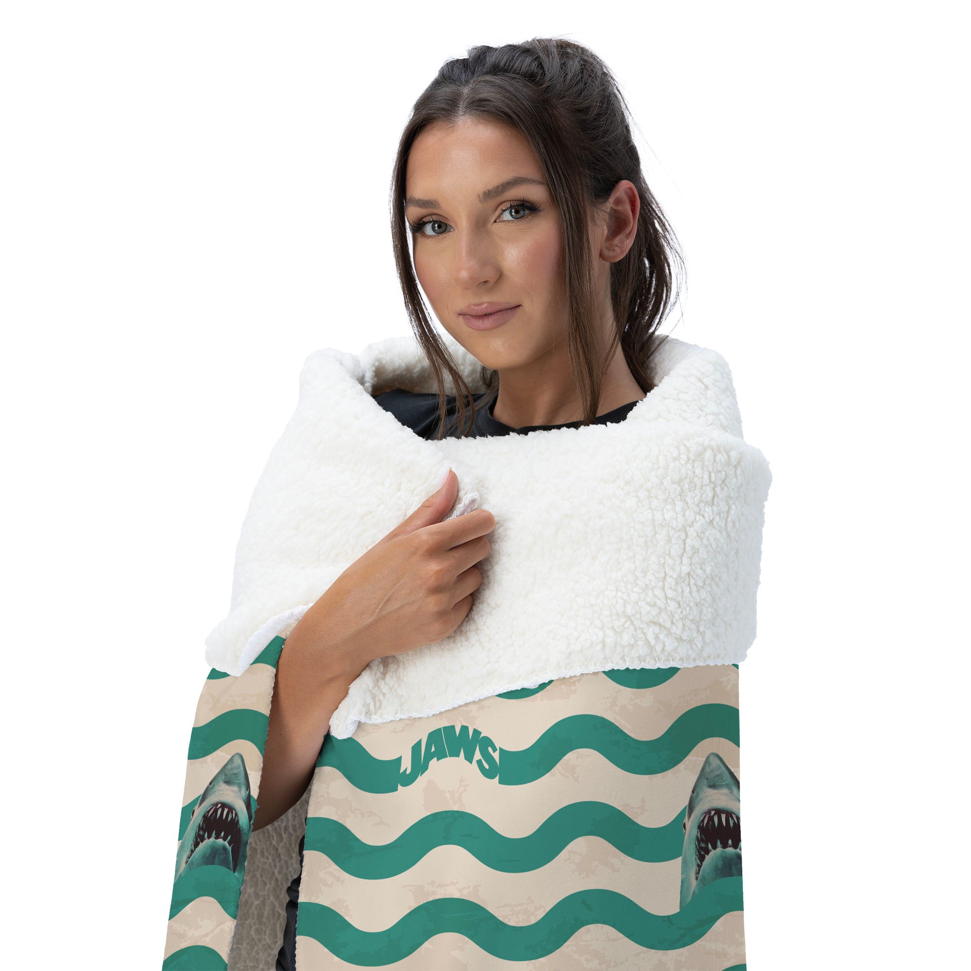 Make a splash in your space with the Universal Jaws "Psychedelic Sea" Silk Touch Sherpa Throw Blanket, featuring a groovy repeating pattern of wavy teal stripes and the iconic shark head peeking through. Made with ultra-soft, velvety fabric, it's the perfect blend of retro style and cozy movie-night comfort for fans of the classic thriller. Bold colors and hypnotic waves add a fun twist to any bed, couch, or home theater, while the repeating design keeps your Jaws fandom front and center. Lightweight yet plush, it's easy to grab for extra warmth or to display as a standout accent. Perfect for gifting or treating yourself, this blanket delivers a soft, laid-back vibe with a touch of suspenseful nostalgia. Wrap up, relax, and channel your inner shark fan every time you cuddle up.