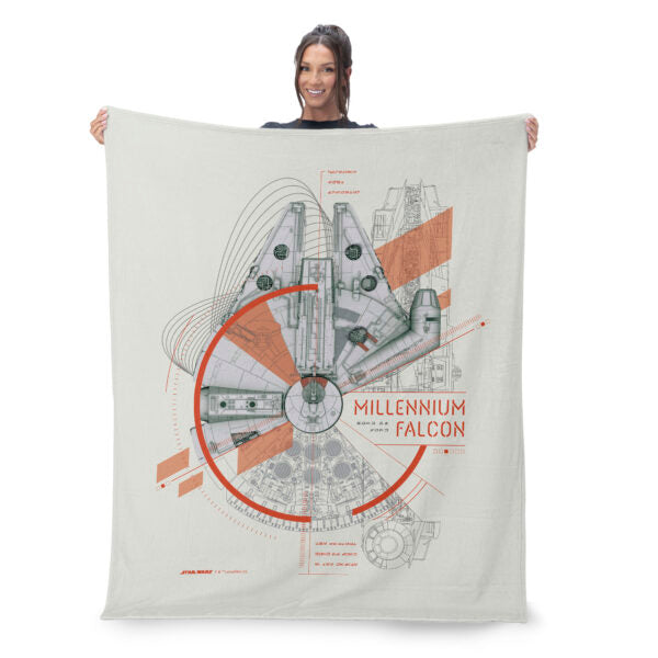 • Featuring a stunning, detailed blueprint design of the iconic Millennium Falcon, this blanket showcases the spacecraft in all its mechanical glory.