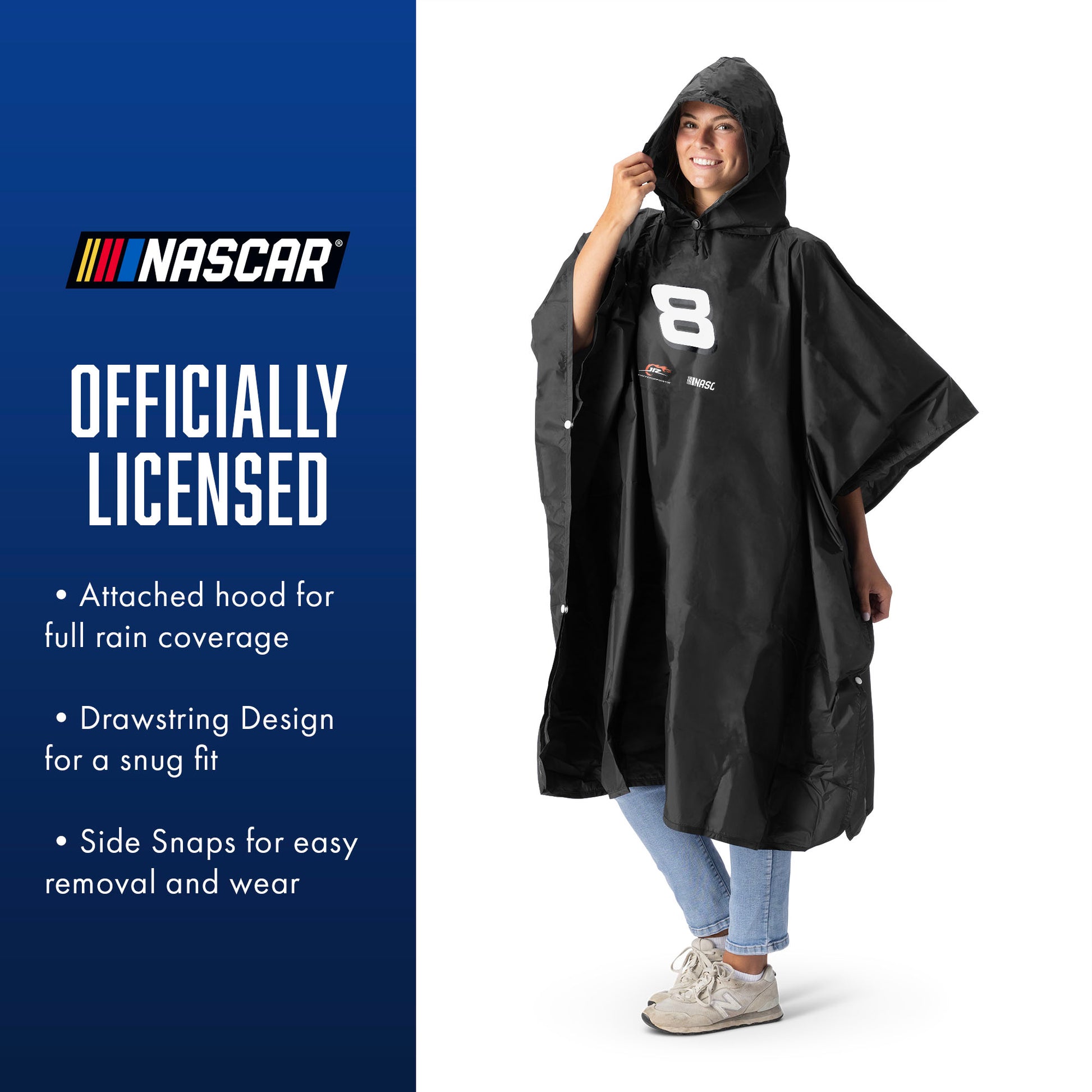 Stay dry and race-ready with the NASCAR Deluxe Pullover Poncho. Perfect for unpredictable weather at the track or anywhere your day takes you, this officially licensed poncho combines functional coverage with fan-favorite branding. Designed with an attached hood and drawstring for full head-to-waist protection, it offers a secure, snug fit in windy conditions. Side snaps make it easy to put on, take off, and adjust for comfort—whether you’re cheering in the stands or walking the infield. Lightweight and packable, it comes with a convenient mesh bag for easy storage and travel. Rain or shine, you’re covered in style and speed.