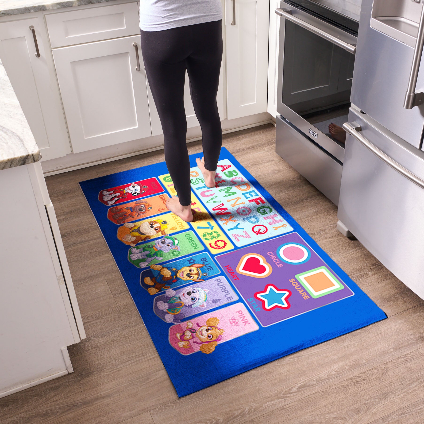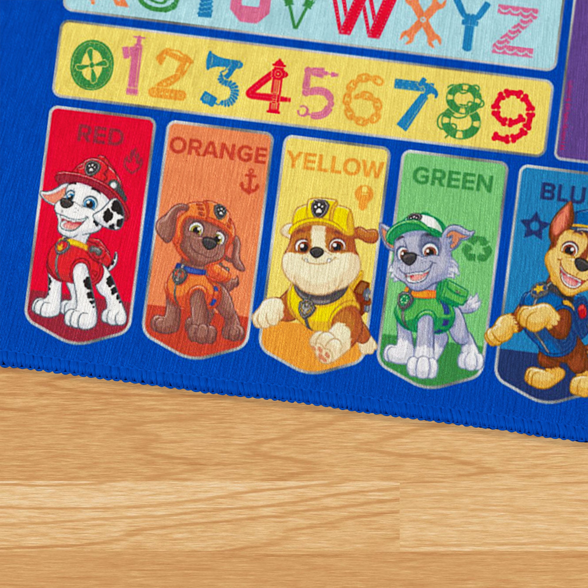 • Featuring colorful designs that teach letters, numbers, shapes, and colors, this interactive rug helps little learners build early skills while playing alongside Chase, Skye, Marshall, and the whole team.