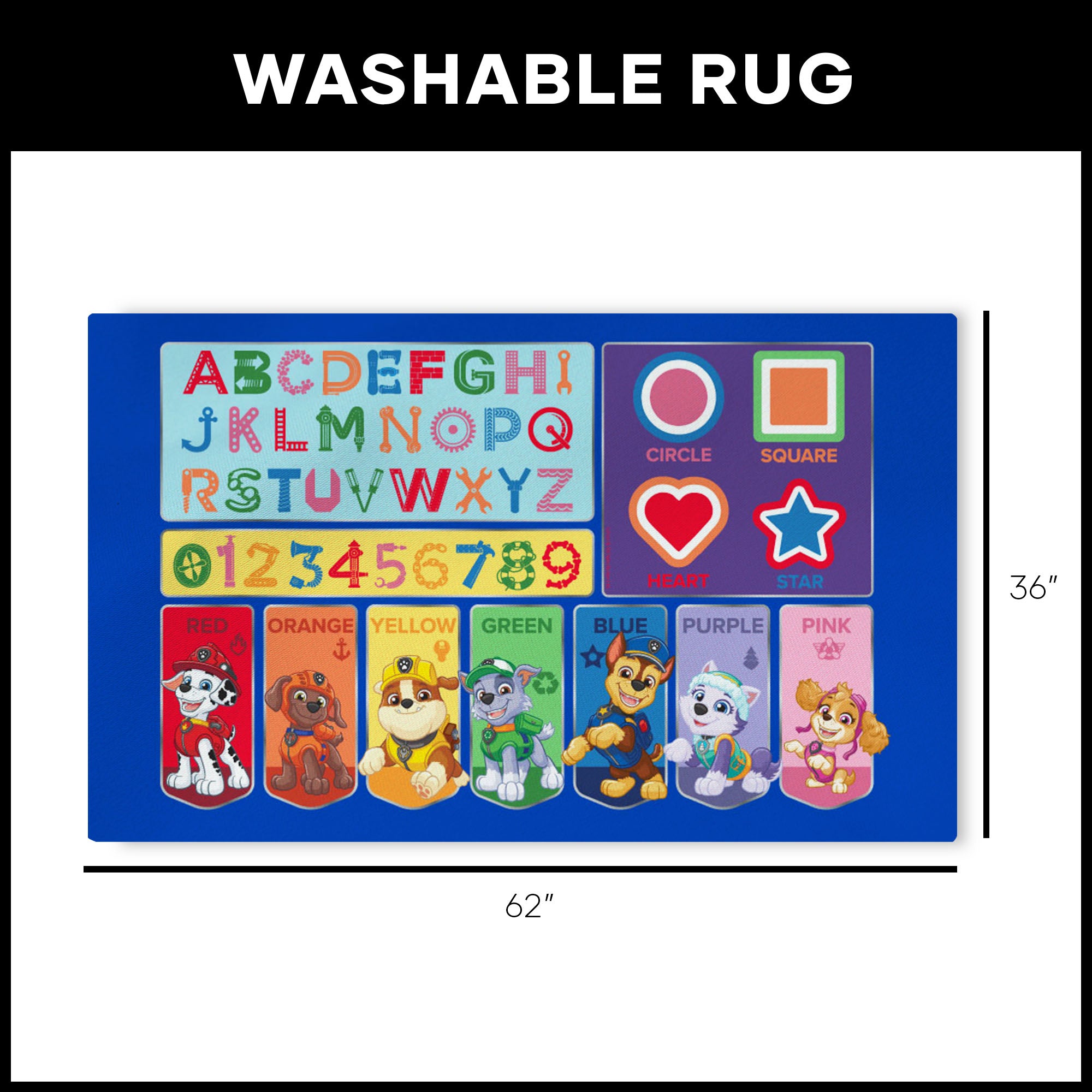 Join your favorite rescue pups on a learning adventure with the PAW Patrol Pups Learn Washable Rug, where fun and education go paw in paw! Featuring colorful designs that teach letters, numbers, shapes, and colors, this interactive rug helps little learners build early skills while playing alongside Chase, Skye, Marshall, and the whole team. The soft, durable surface provides a comfy place for reading, learning, and play, while the machine-washable design makes cleanup easy for parents. Officially Licensed and designed to inspire curiosity and teamwork, this educational rug makes an excellent gift for preschoolers and PAW Patrol fans alike. Perfect for bedrooms, classrooms, or play areas, it turns every mission into a learning adventure — because with the pups, no job (or lesson) is too big, and no learner is too small!