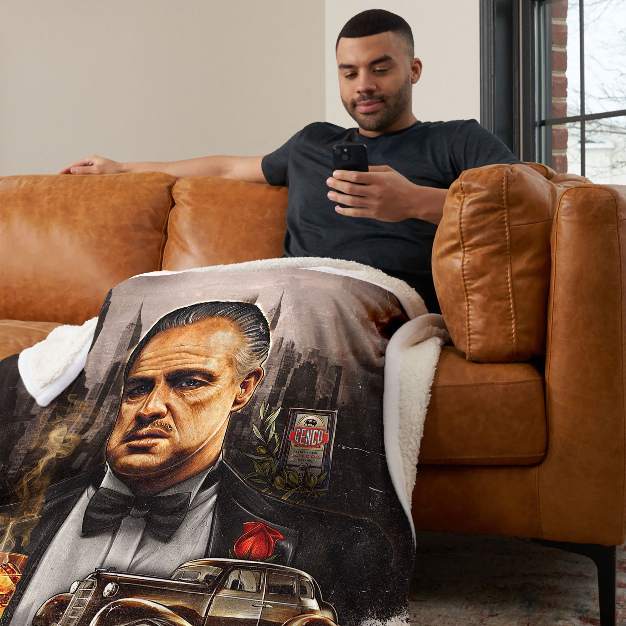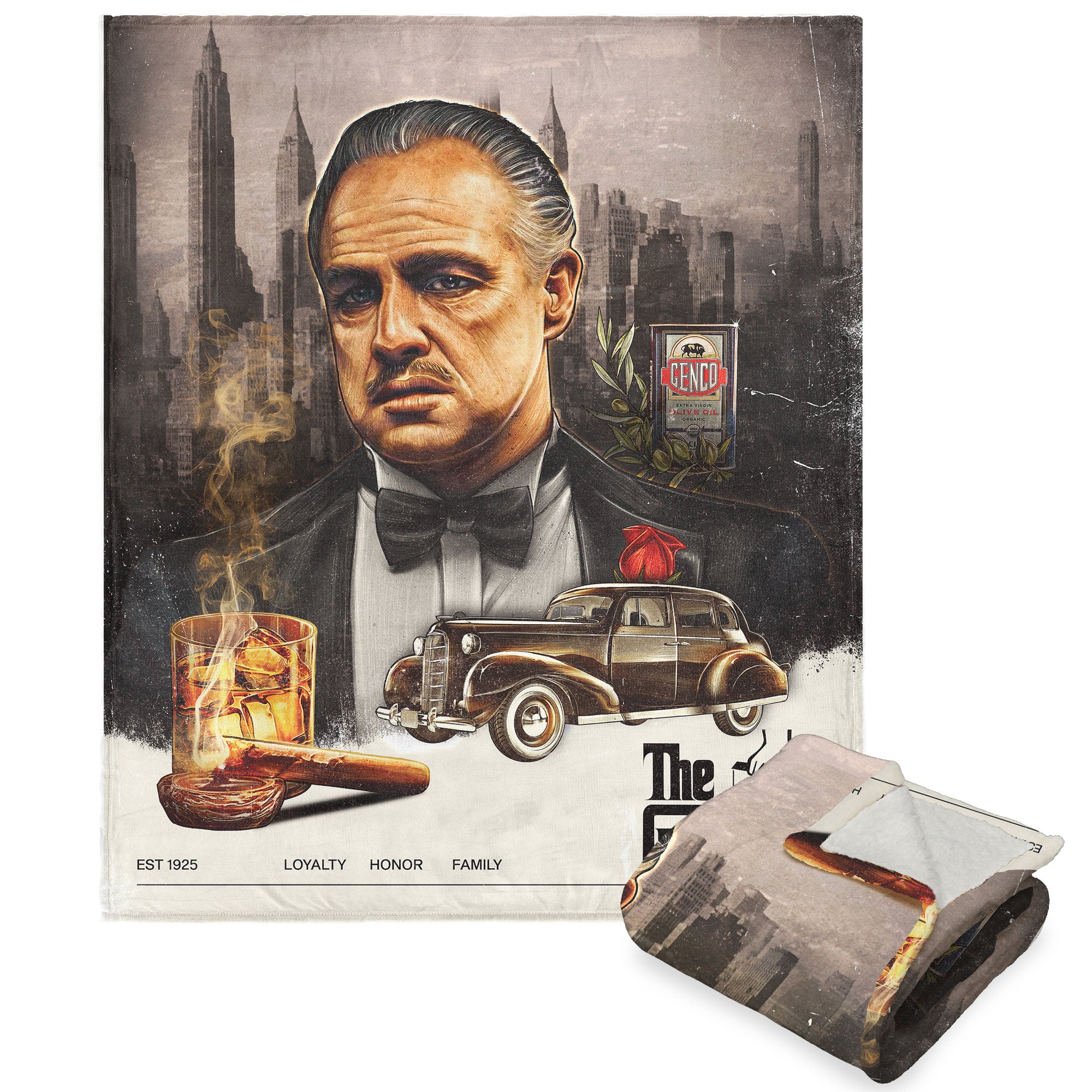 Immerse yourself in the timeless legacy of The Godfather with this "Godfather Poster" Silk Touch Sherpa Throw. Showcasing the formidable Don Vito Corleone, this luxurious throw brings a piece of cinematic history into your home. The iconic Godfather logo, set against the backdrop of the city, adds a touch of authenticity and elegance. Crafted with ultra-soft, silk touch fabric, this throw combines comfort with style. Perfect for draping over your couch or snuggling up during movie nights, it adds a sophisticated touch to any space. Celebrate the enduring legacy of The Godfather and make a statement with this beautifully designed throw that combines comfort, style, and the timeless allure of one of cinema's greatest sagas.