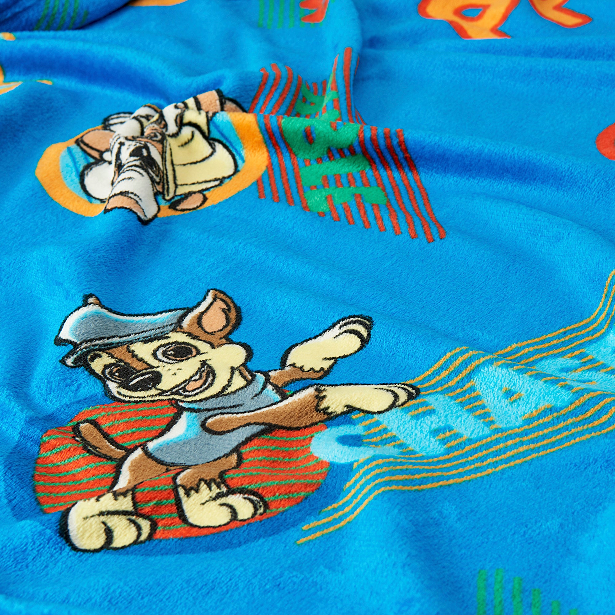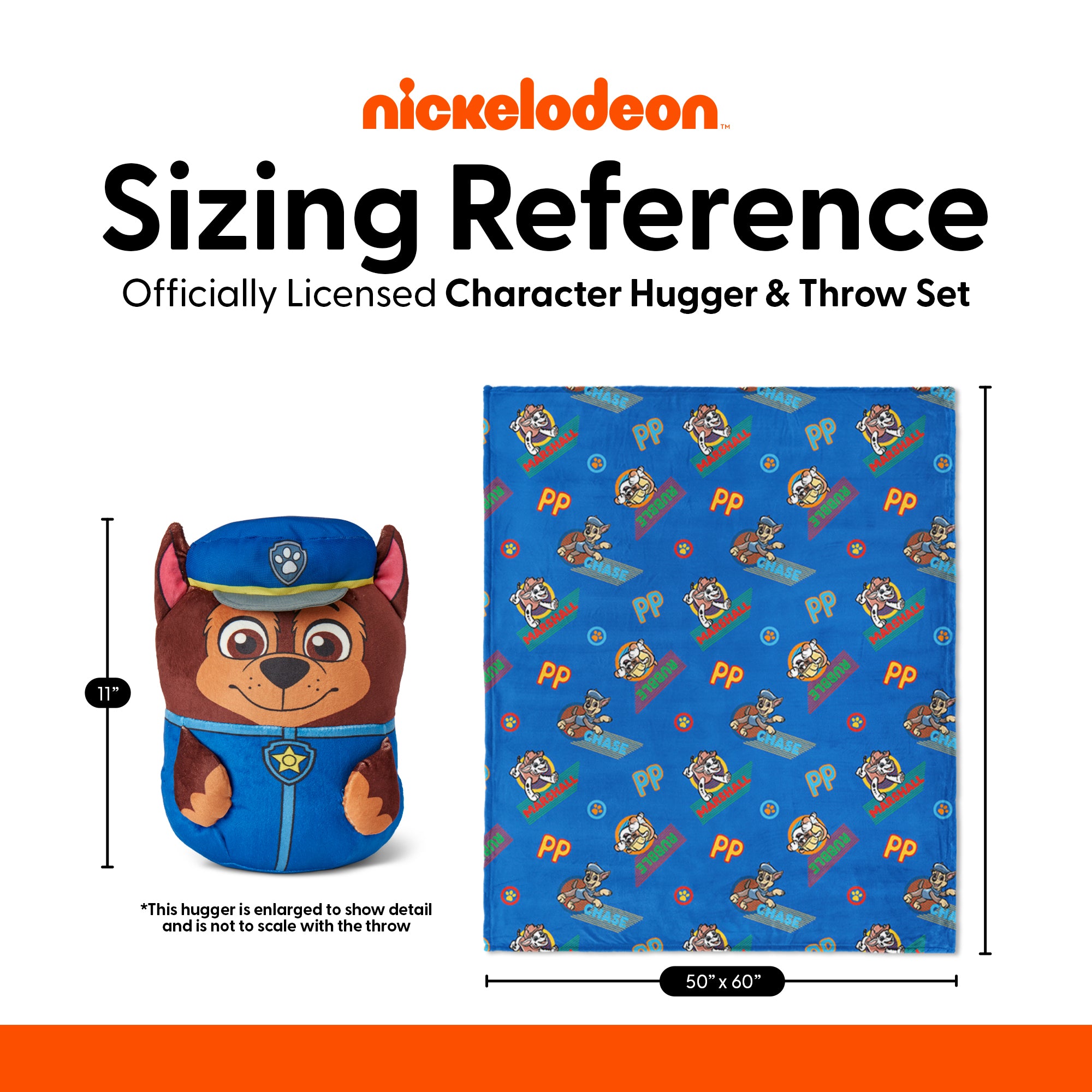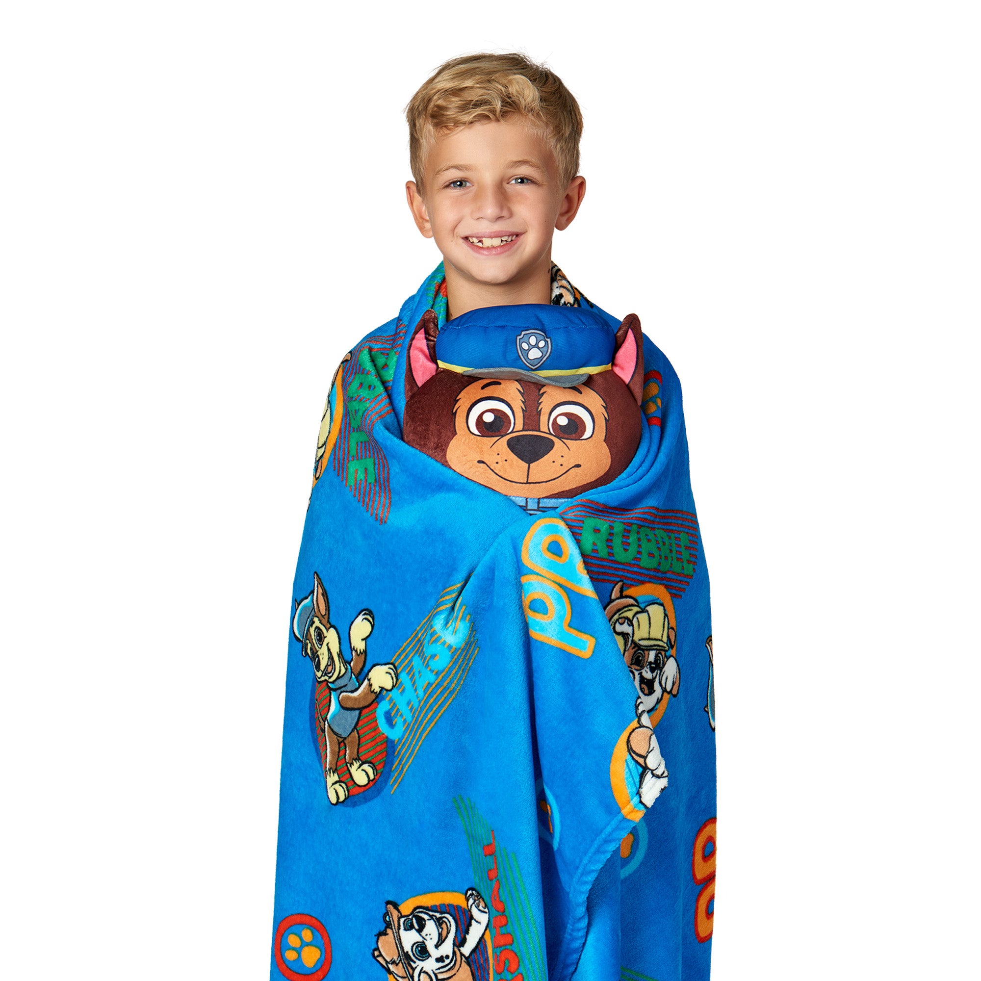 • Featuring everyone’s favorite pups, including Chase and Rubble, the vibrant blue throw is decorated with fun action-packed poses, paw prints, and bright character graphics. The set includes a matching hugger shaped like Chase in his police pup uniform.