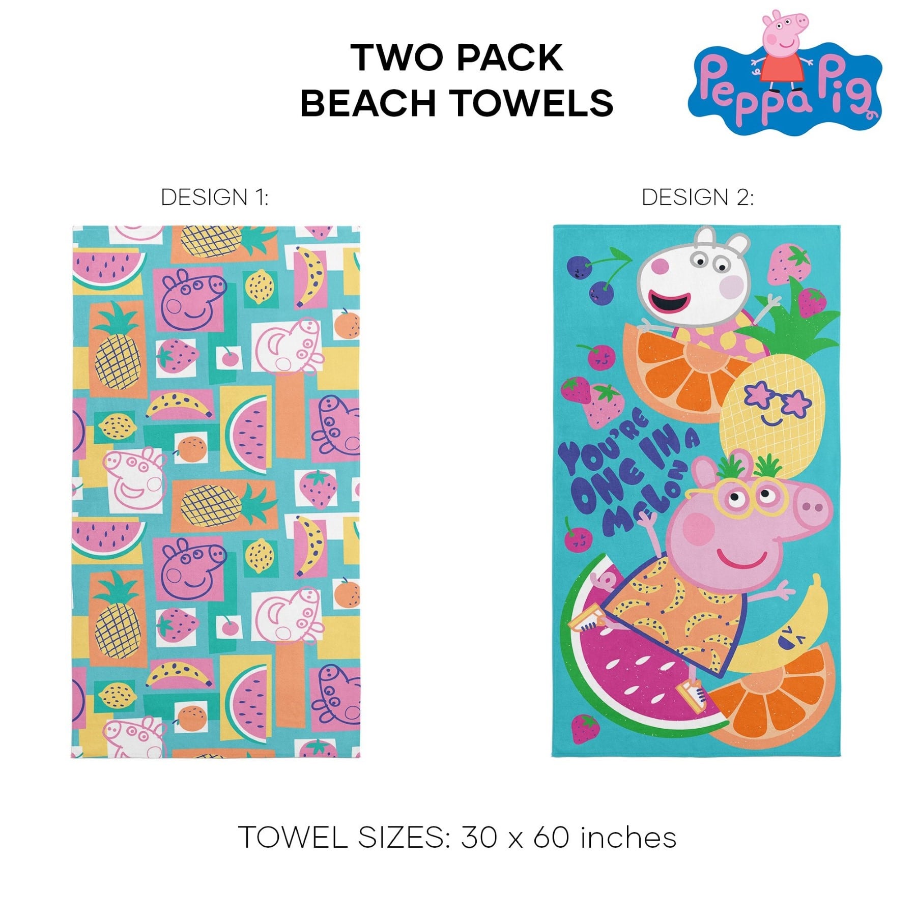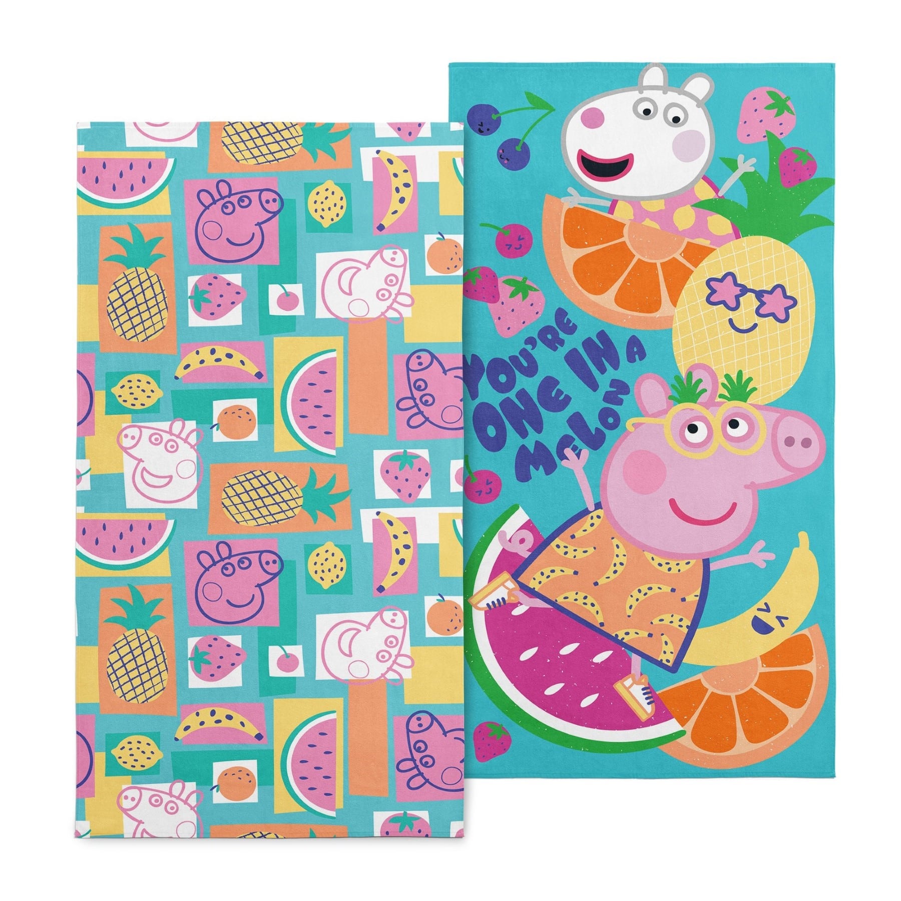 - Features playful and colorful images of Peppa Pig and delicious fruit, adding a cheerful and summery vibe to your beach gear on one towel. The other towel showcases Peppa Pig and Suzy Sheep against a vibrant fruit-filled background, with the heartwarming message "You're one in a melon" perfect for spreading positivity and joy.