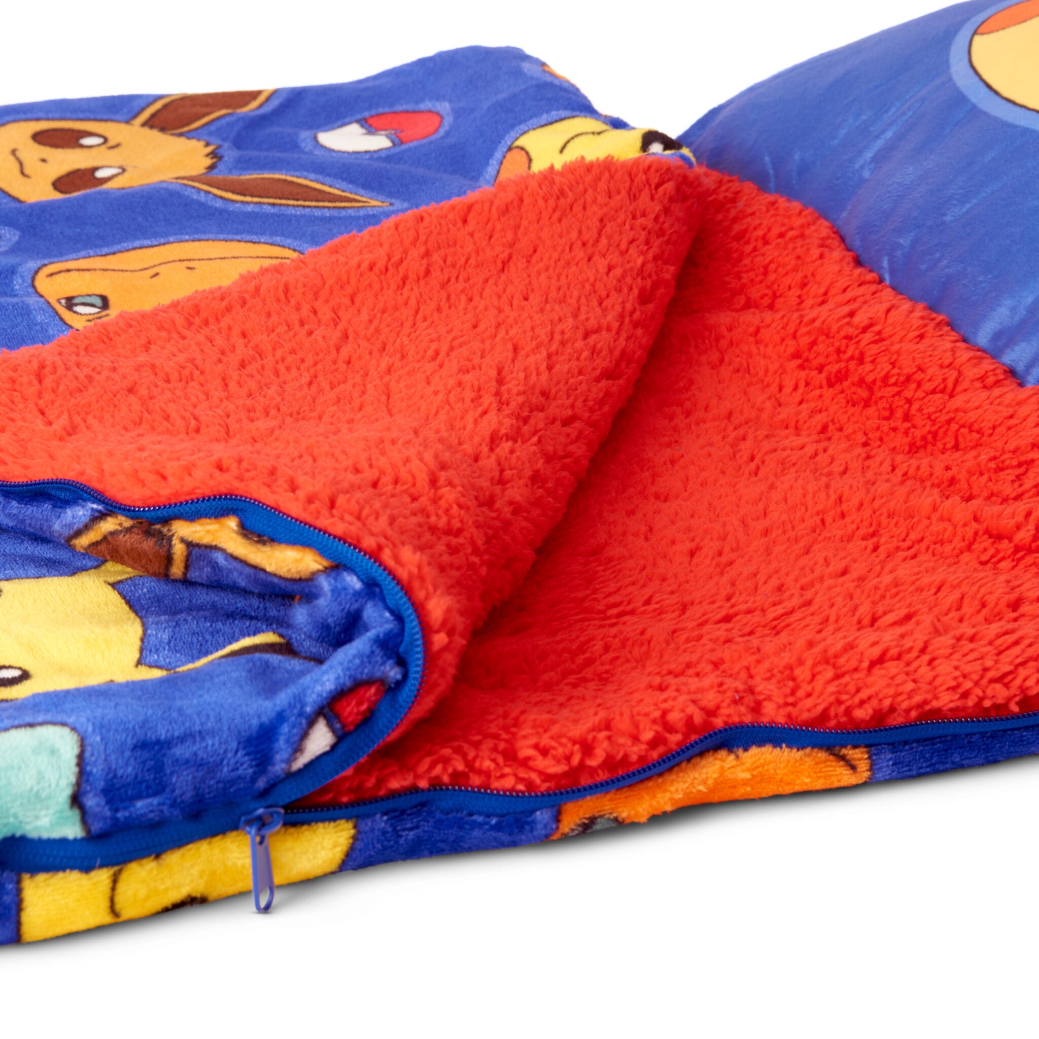 • Featuring Pikachu, Eevee, Charmander, Squirtle, and Bulbasaur in a vibrant allover print with Poké Balls, this ultra-soft slumber bag is perfect for sleepovers, movie nights, or nap-time missions.