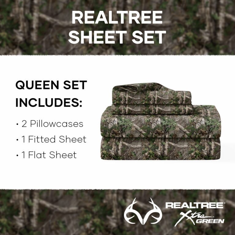 Drift off to sleep in this Realtree "Xtra Green Camo" 4-Piece Queen Sheet Set by TheNorthwest. You'll never want to get out of bed in the morning! Complete your bedding ensemble with this 4-piece queen sheet set featuring green leaves and trees in a repeating design. The pillowcases are coordinated to the sheets, with a large, bold logo. This set comes with one 90"x 102" flat sheet, one 60"x 80" fitted sheet with a 12" pocket, and two standard-size pillowcases (20"x 30") and fits most queen sized beds.