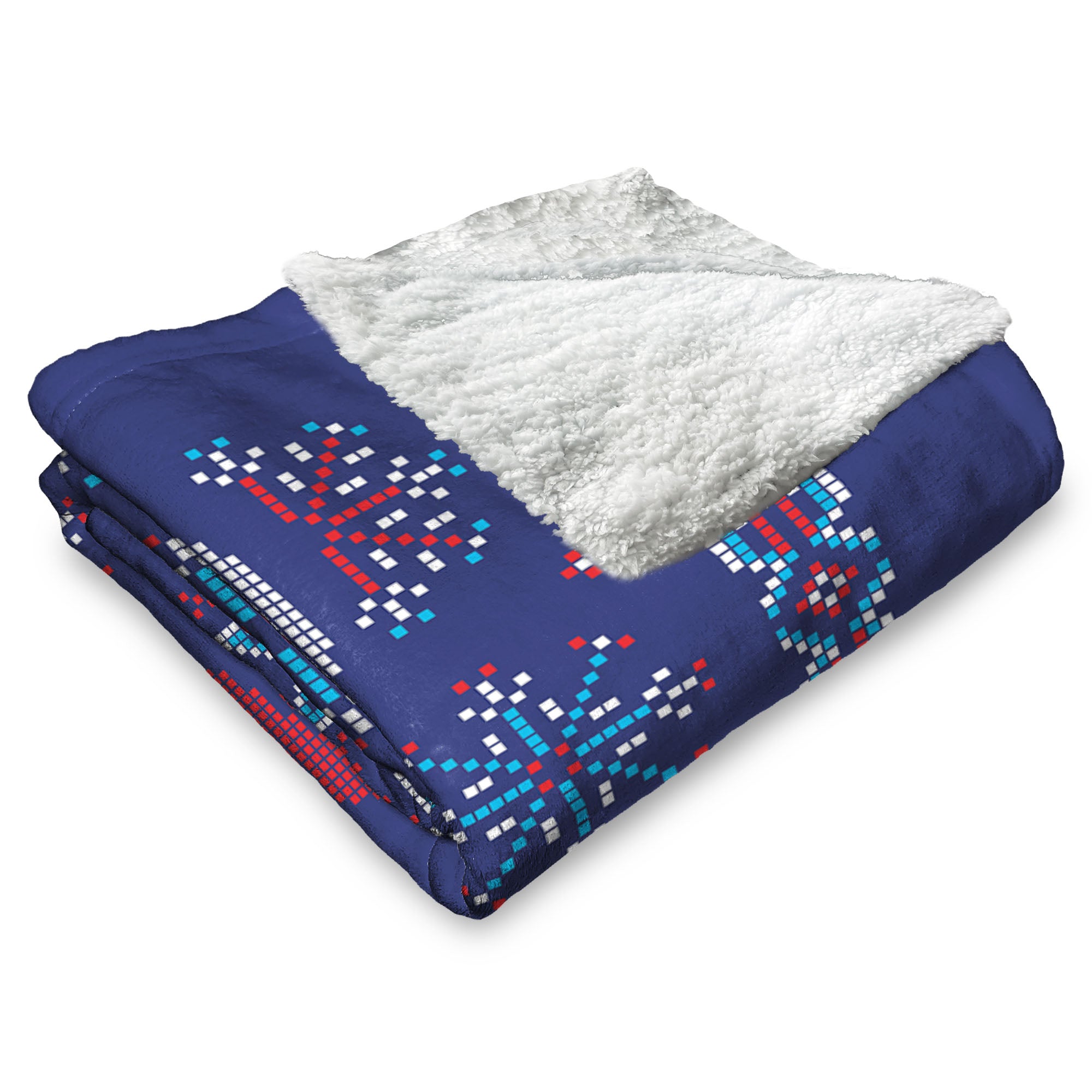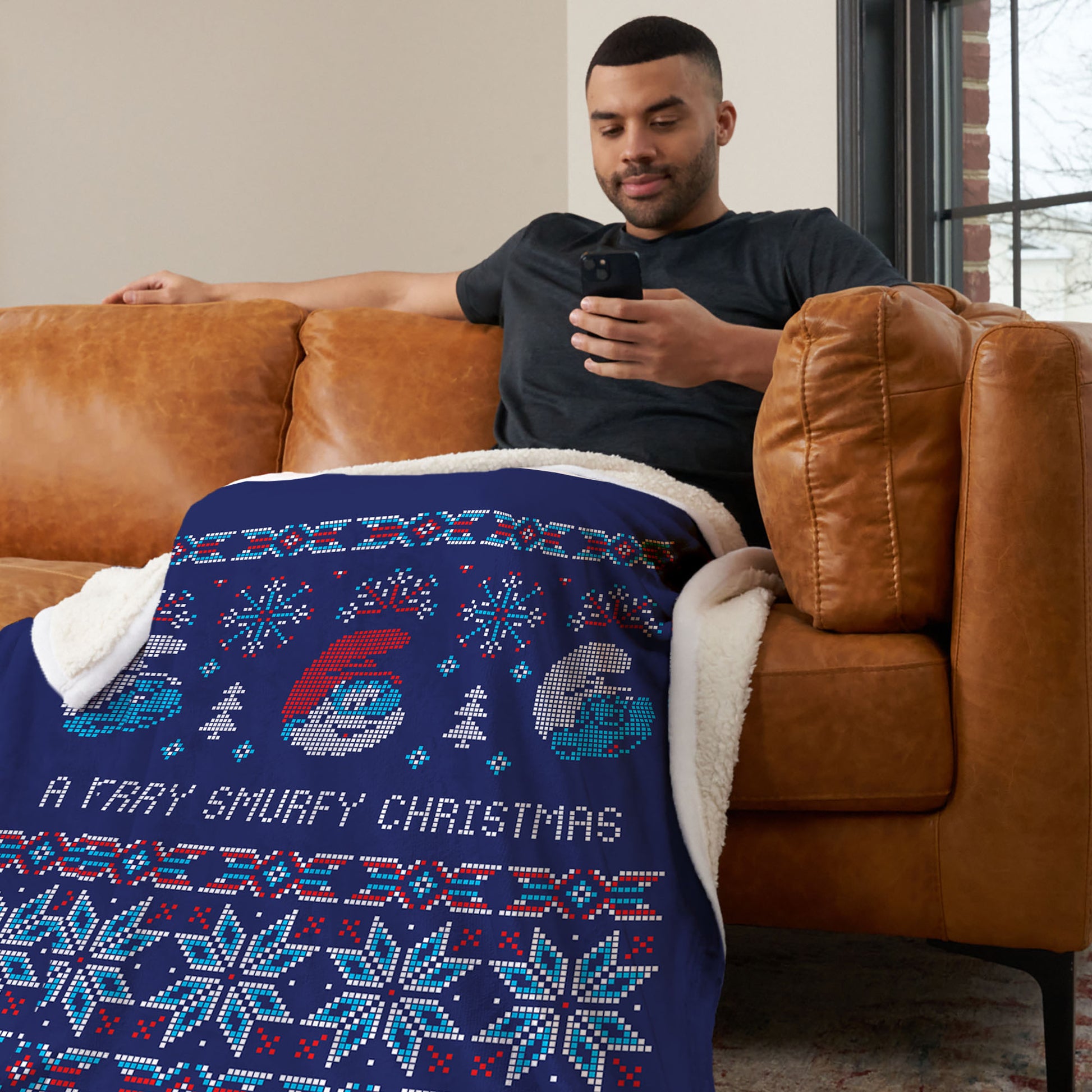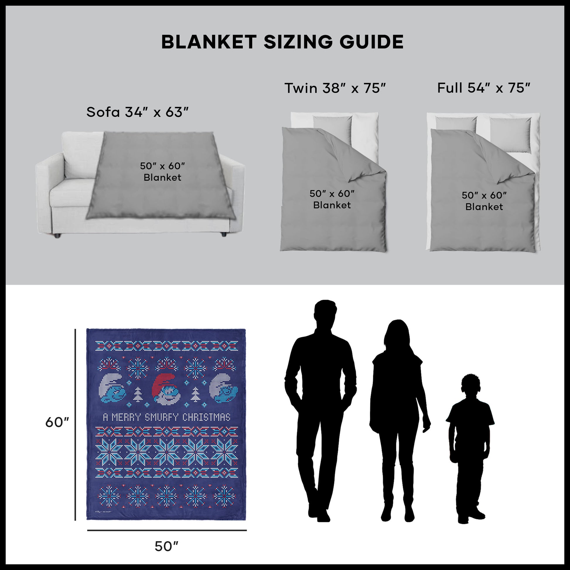 • Featuring a holiday-stitched sweater pattern, this blanket showcases Papa Smurf front and center, flanked by two playful Smurfs.