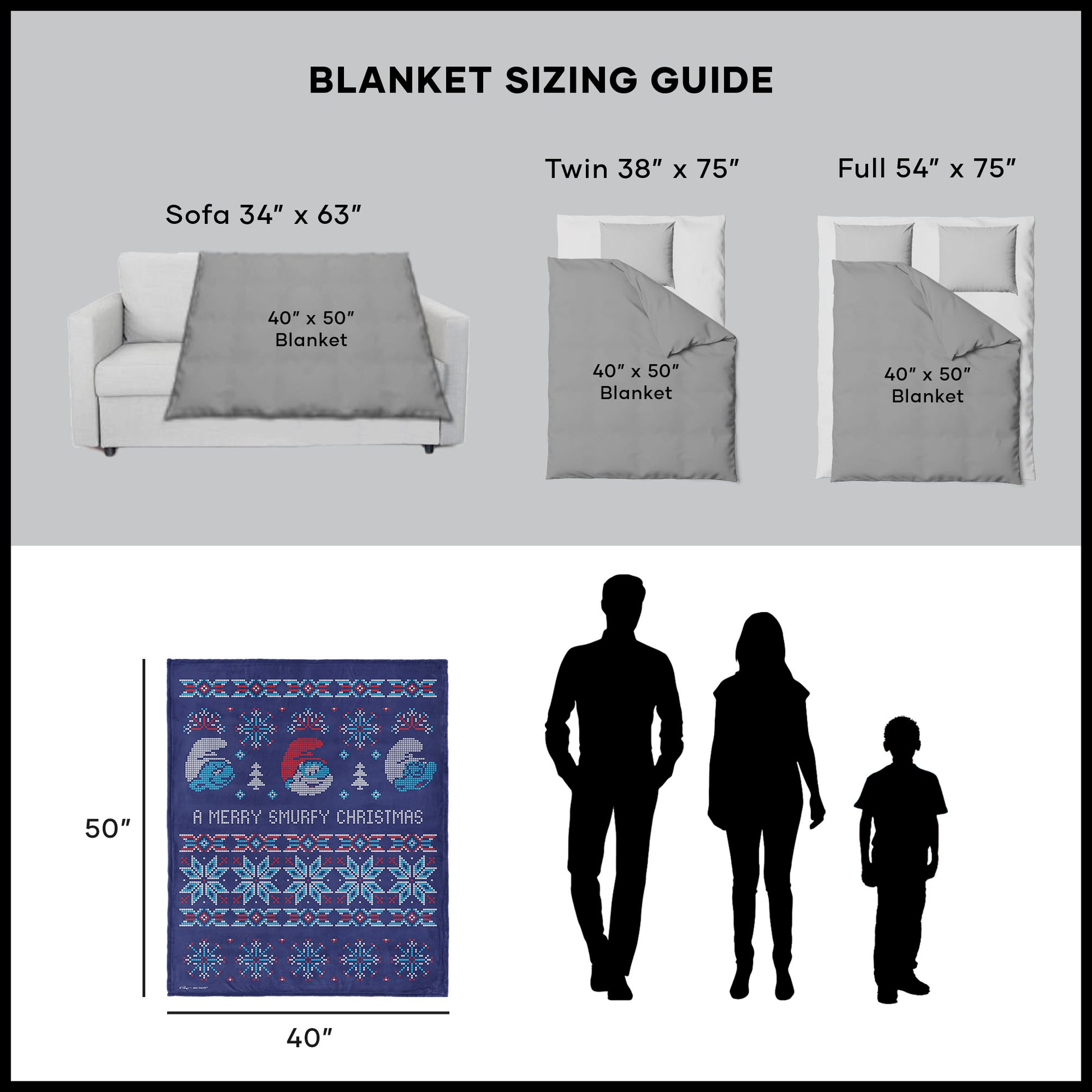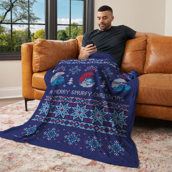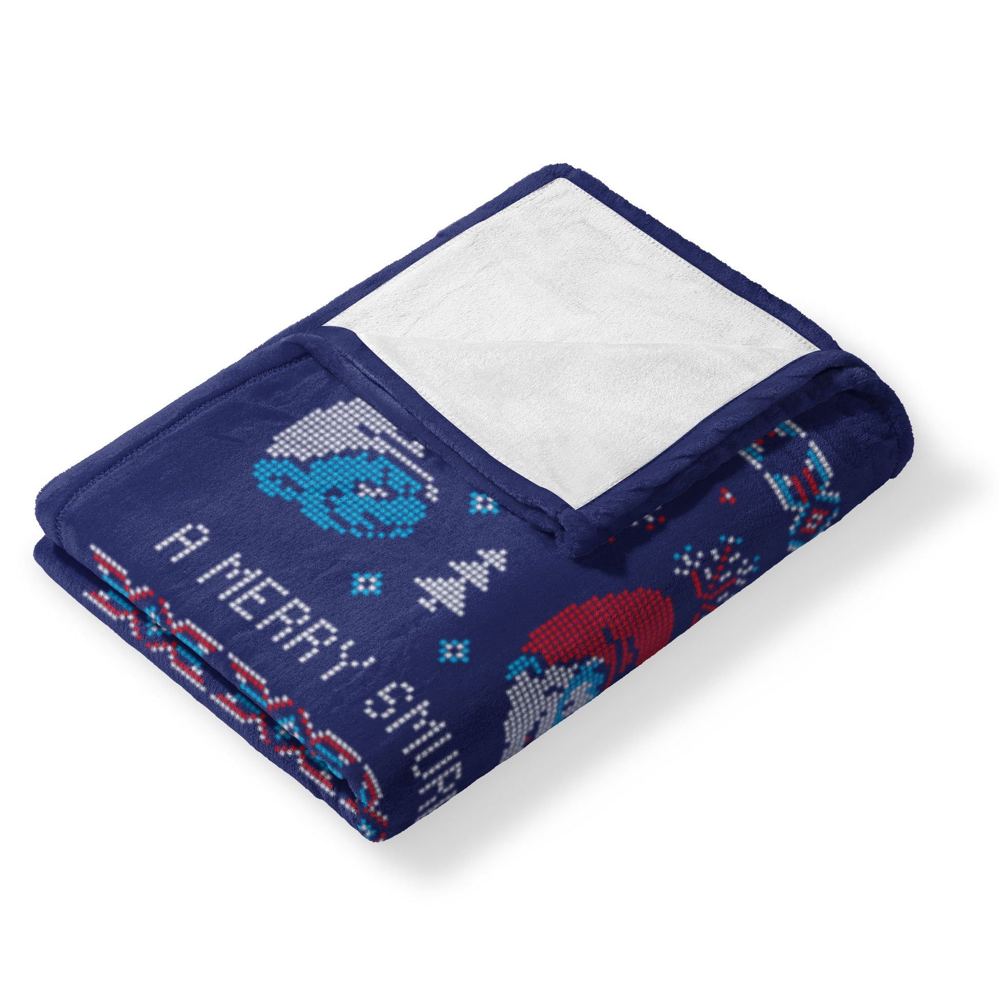 • Featuring a holiday-stitched sweater pattern, this blanket showcases Papa Smurf front and center, flanked by two playful Smurfs.