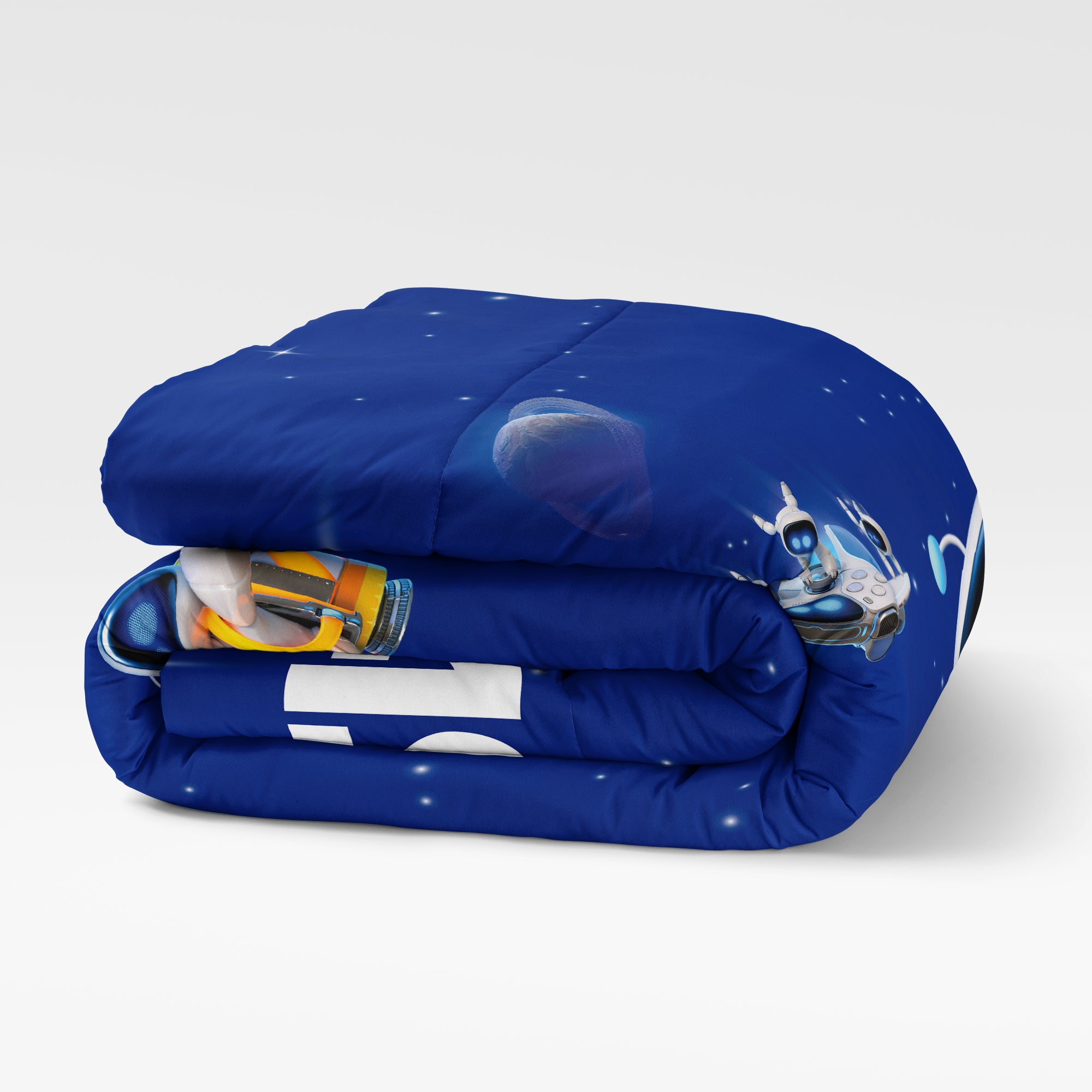 Blast off into bedtime adventure! PlayStation "Cosmic Clash" Bed In Bag 4-Piece Twin Set features a bold Astro Bot space scene comforter with vibrant character graphics on the front and a coordinating micro-print reverse, paired with matching character icon sheets. 4-piece Twin set includes 1 reversible comforter, 1 fitted sheet, 1 flat sheet, and 1 standard pillowcase, crafted from soft microfiber with cozy fill for everyday comfort and standout style. Officially Licensed Sony design brings authentic Astro Bot artwork fans instantly recognize. Lightweight, breathable fabric offers smooth comfort for year-round use, while the reversible comforter delivers two looks in one. Perfect as a gift for young gamers and PlayStation fans, this complete twin bedding set makes bedroom upgrades easy with coordinated, space-inspired style.