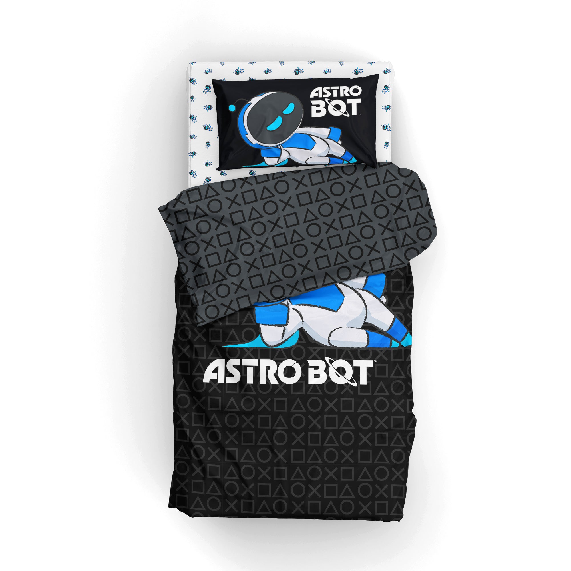 Drift off in gamer style! PlayStation "Relax Astro" Bed In Bag 4-Piece Twin Set features a bold Astro Bot comforter with oversized character artwork on the front and a sleek controller-icon pattern on the reverse, paired with coordinating Astro Bot printed sheets. 4-piece Twin set includes 1 reversible comforter, 1 fitted sheet, 1 flat sheet, and 1 standard pillowcase, crafted from soft microfiber with plush fill for standout comfort and everyday durability. Officially Licensed PlayStation design delivers authentic Astro Bot graphics fans instantly recognize. Lightweight, breathable fabric offers smooth comfort for year-round use, while the reversible comforter provides two dynamic looks in one. Perfect as a gift for young gamers and PlayStation fans, this twin bedding set makes bedroom makeovers easy with cool, character-driven style.