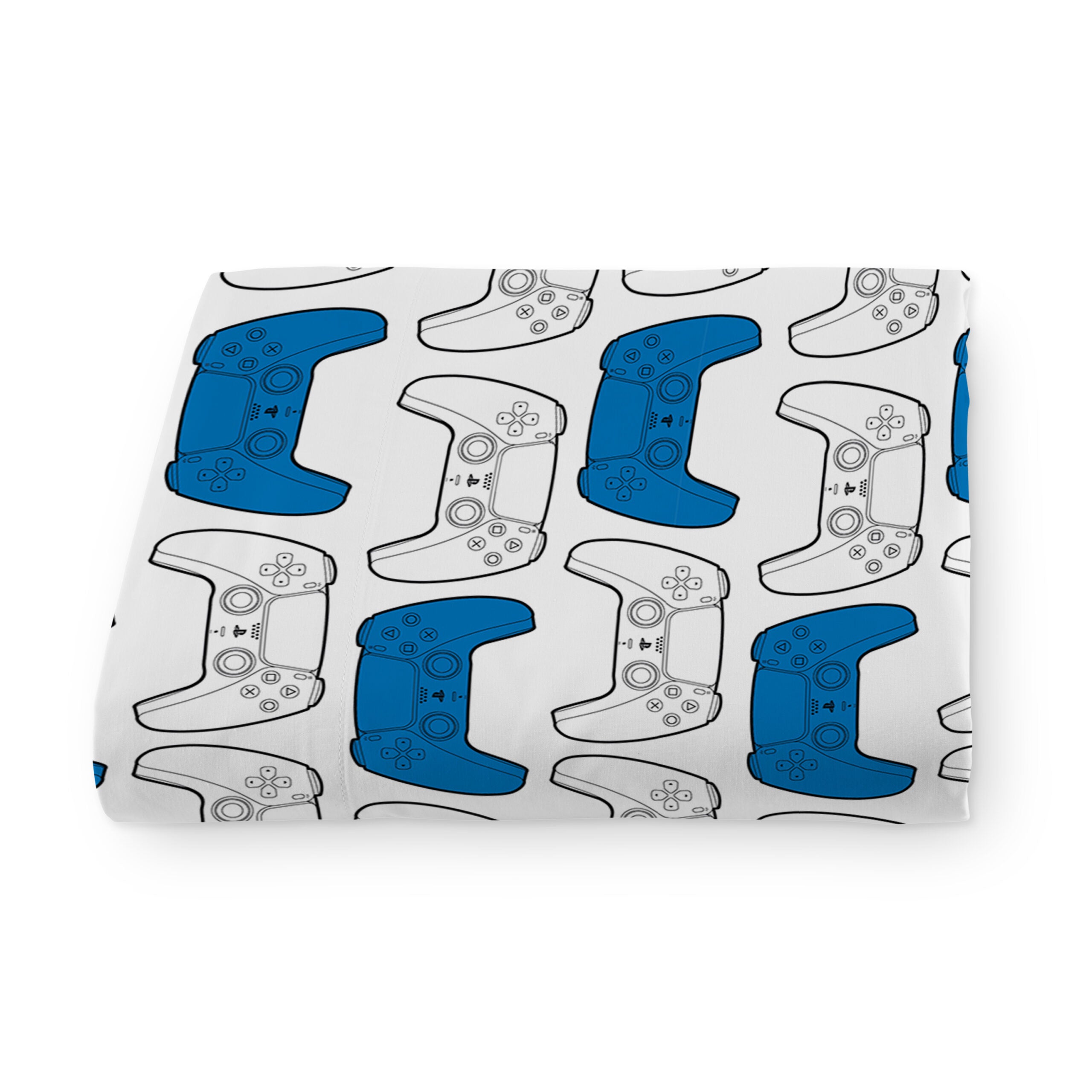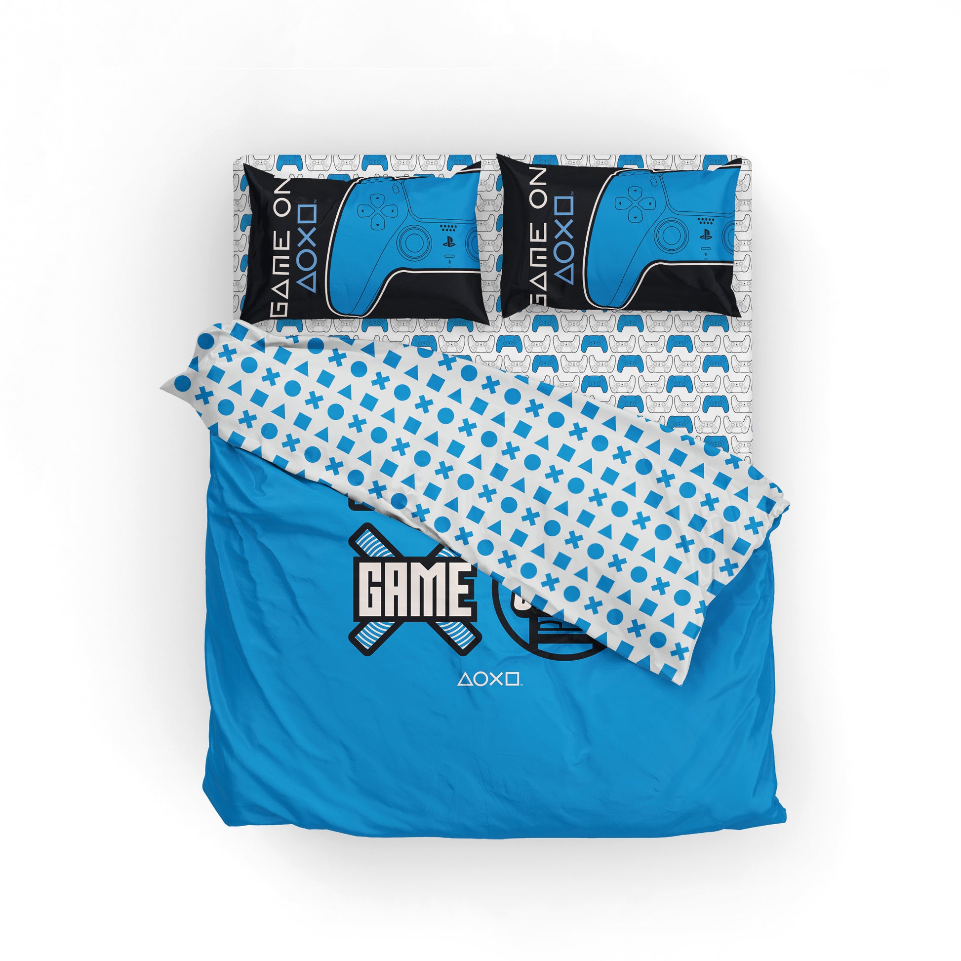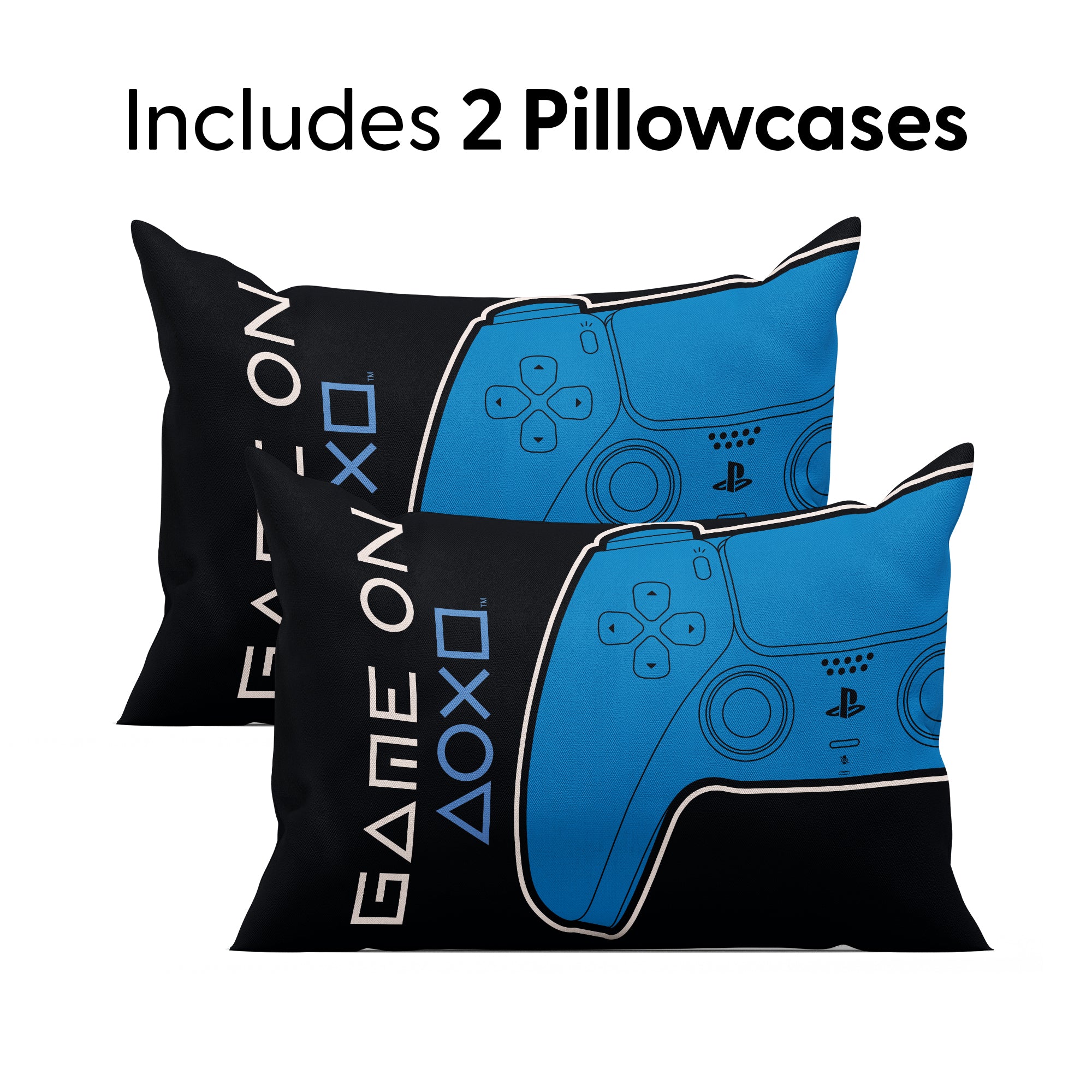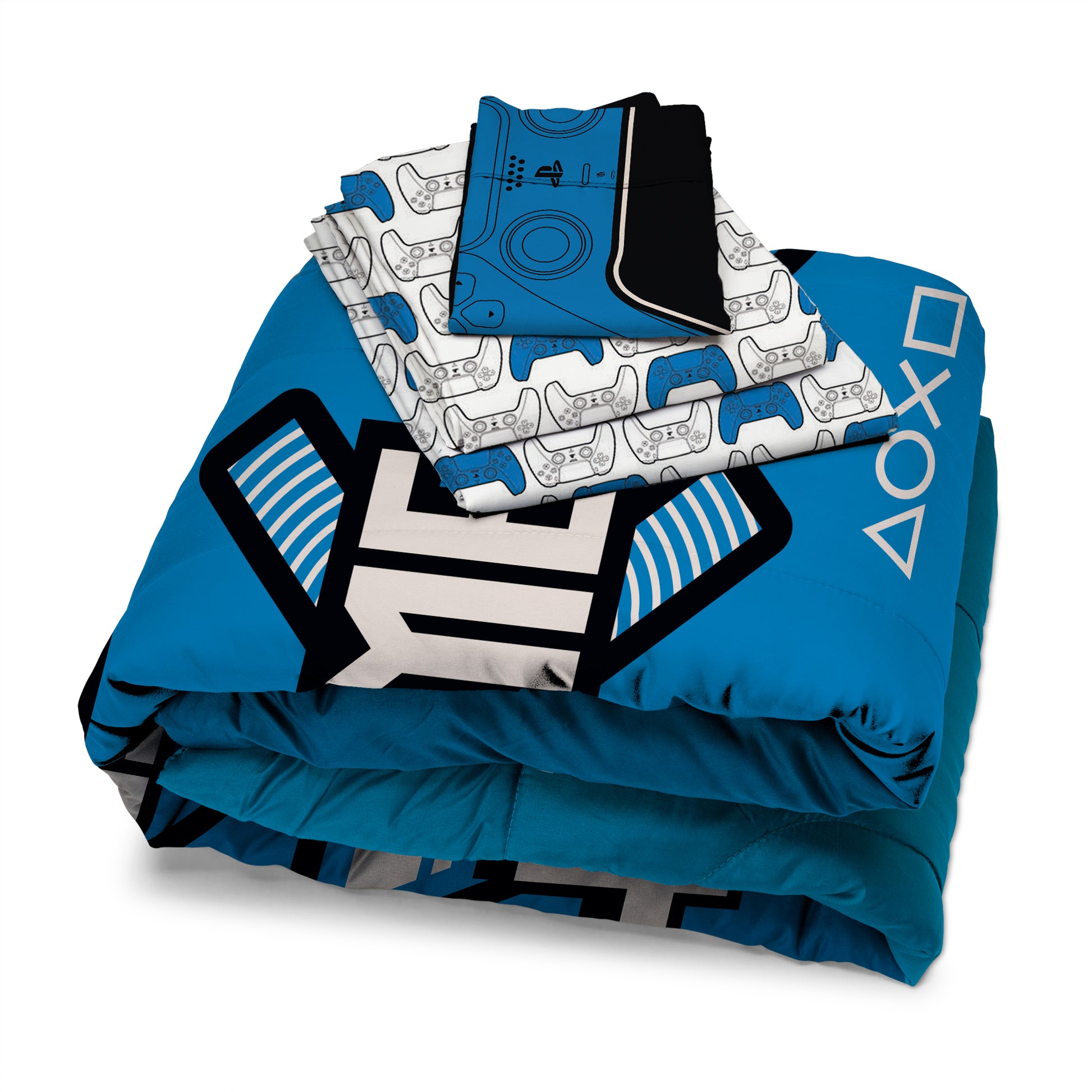 Level up every night! PlayStation "Play On" Bed In Bag 5-Piece Full Set features a bold comforter showcasing iconic PlayStation graphics with Eat. Game. Sleep. messaging on the front and a coordinating controller-symbol pattern on the reverse. Matching controller-print sheets complete the fully coordinated gamer look. 5-piece Full set includes 1 reversible comforter, 1 fitted sheet, 1 flat sheet, and 2 standard pillowcases, crafted from soft microfiber with plush fill for standout comfort and everyday durability. Officially Licensed PlayStation design delivers authentic branding fans instantly recognize. Lightweight, breathable fabric provides smooth, year-round comfort, while the reversible comforter offers two dynamic styles in one. Perfect as a gift for gamers of all ages, this full bedding set makes bedroom refreshes effortless with bold, game-inspired energy.