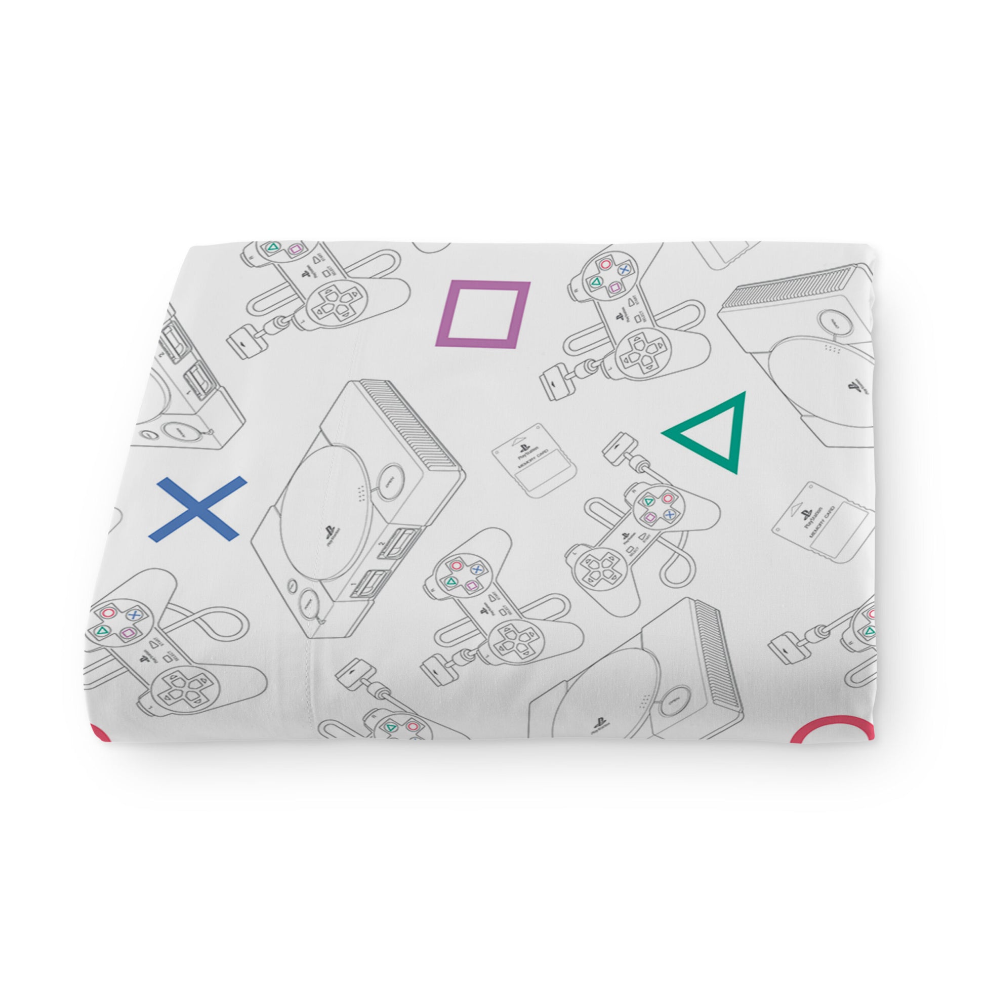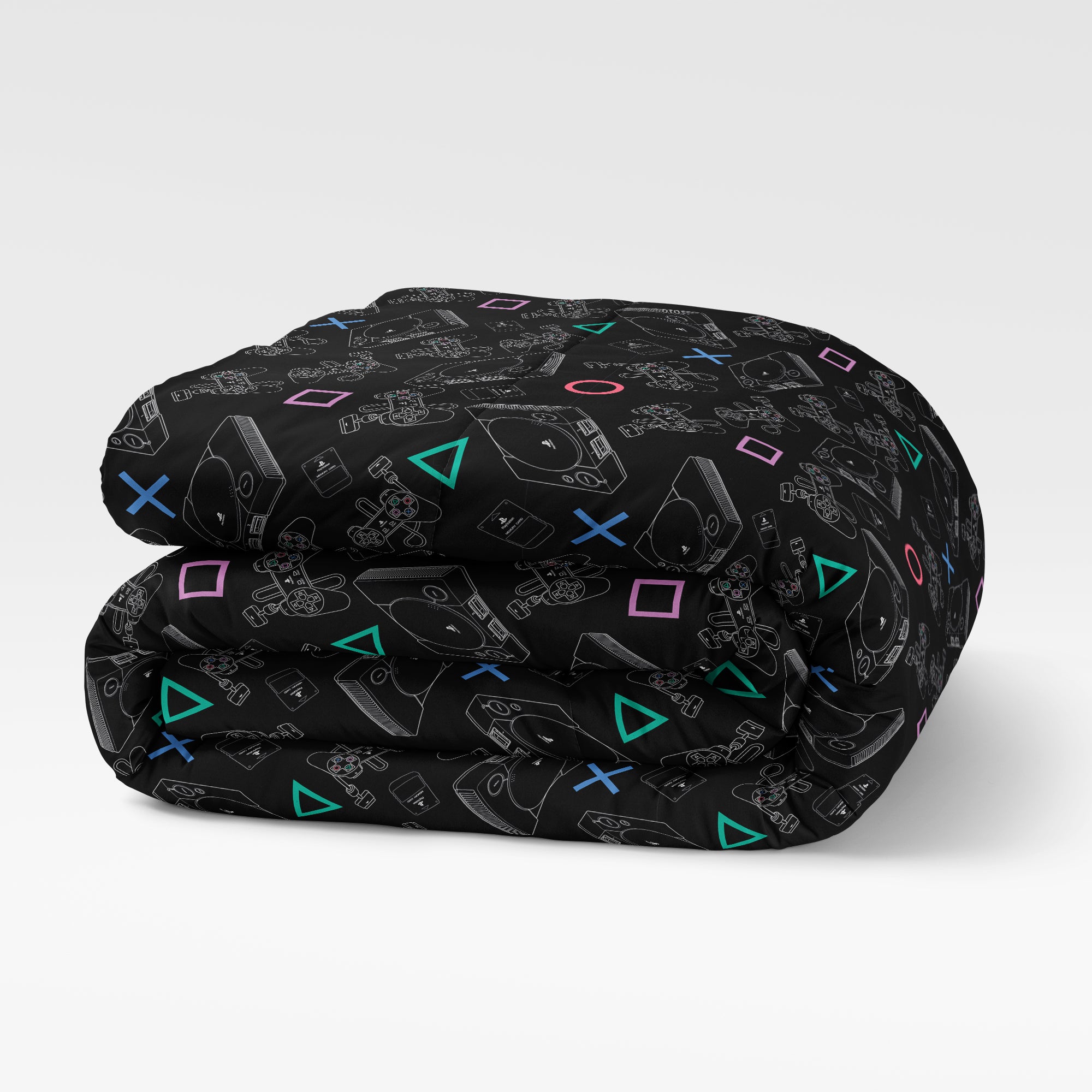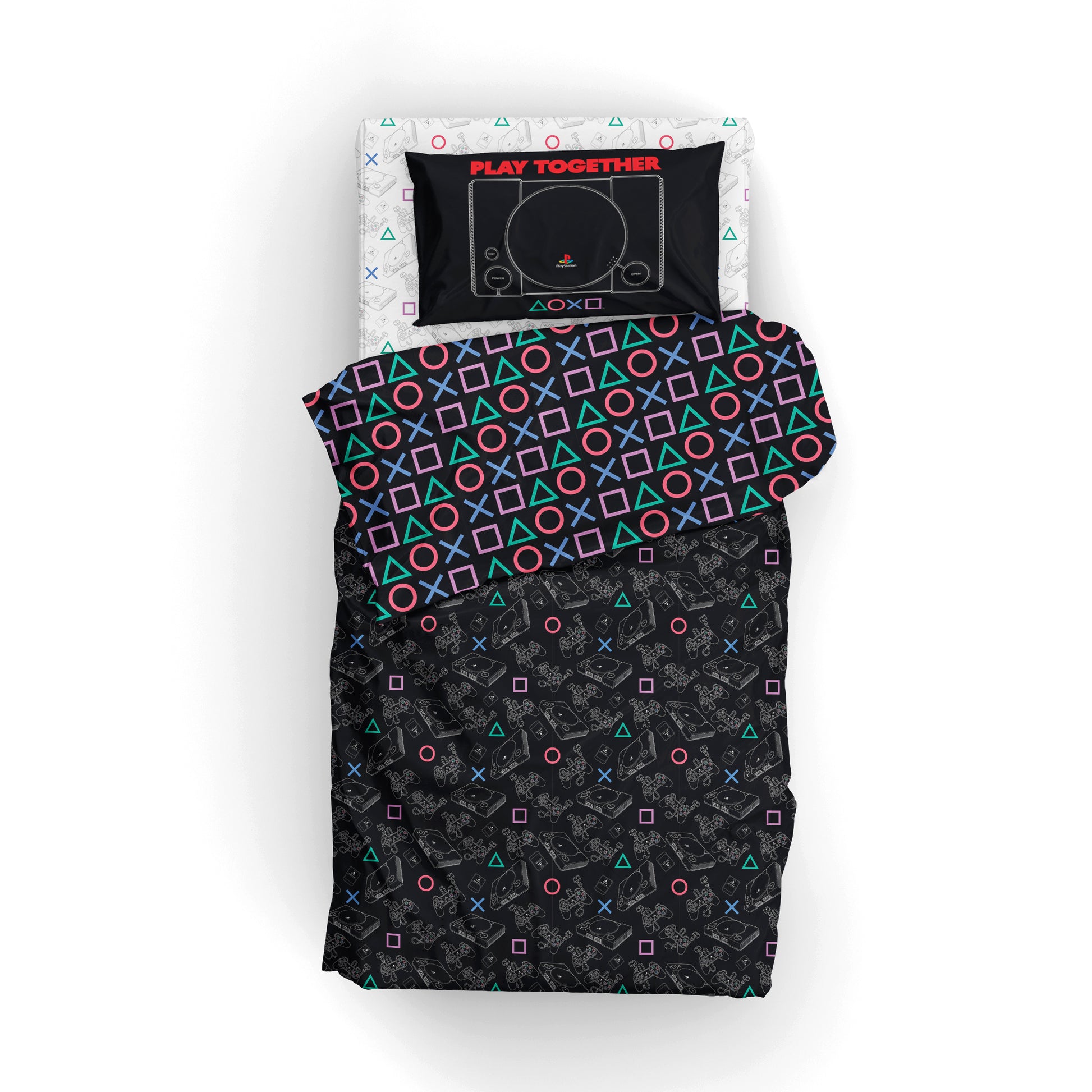 Game night never ends! PlayStation "Play Together" Bed In Bag 4-Piece Twin Set features a bold comforter with allover retro PlayStation console and controller graphics on the front and a vibrant controller-symbol pattern on the reverse. Coordinating printed sheets complete the gamer-inspired look. 4-piece Twin set includes 1 reversible comforter, 1 fitted sheet, 1 flat sheet, and 1 standard pillowcase, crafted from soft microfiber with plush fill for everyday comfort and standout style. Officially Licensed PlayStation design delivers authentic branding and nostalgic console artwork fans instantly recognize. Lightweight, breathable fabric offers smooth comfort for year-round use, while the reversible comforter gives you two dynamic looks in one. Perfect as a gift for gamers of all ages, this twin bedding set makes bedroom updates effortless with bold, multiplayer-inspired energy.