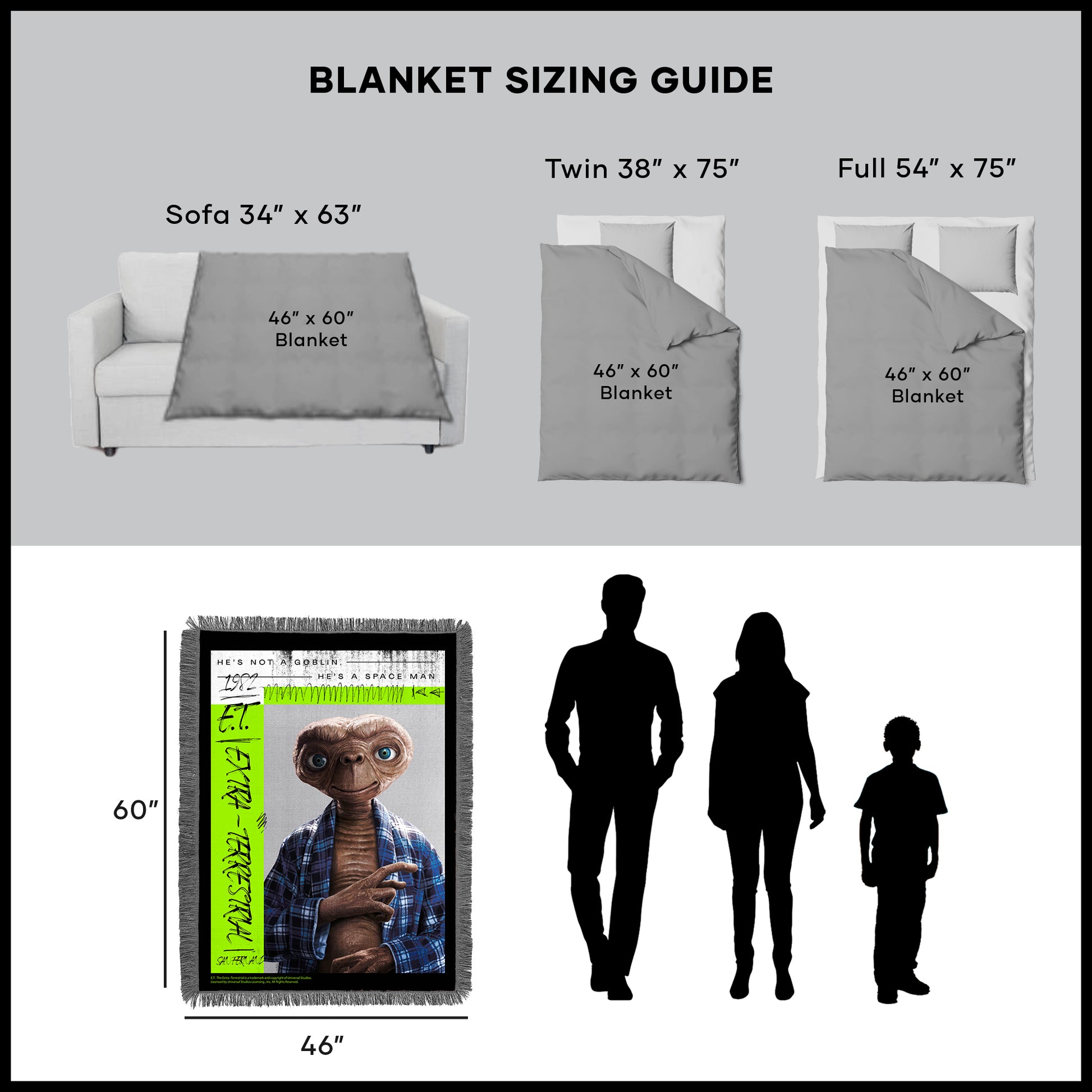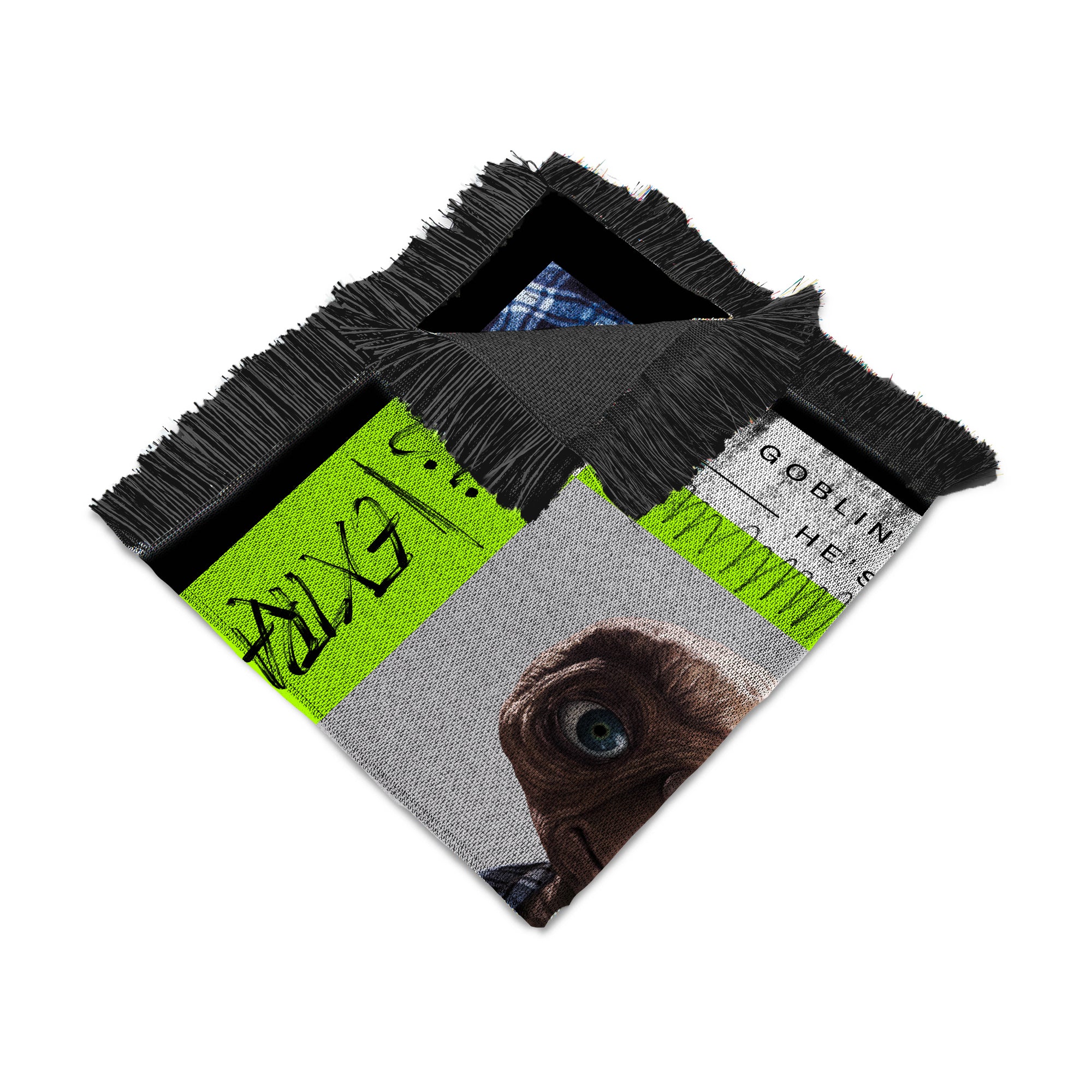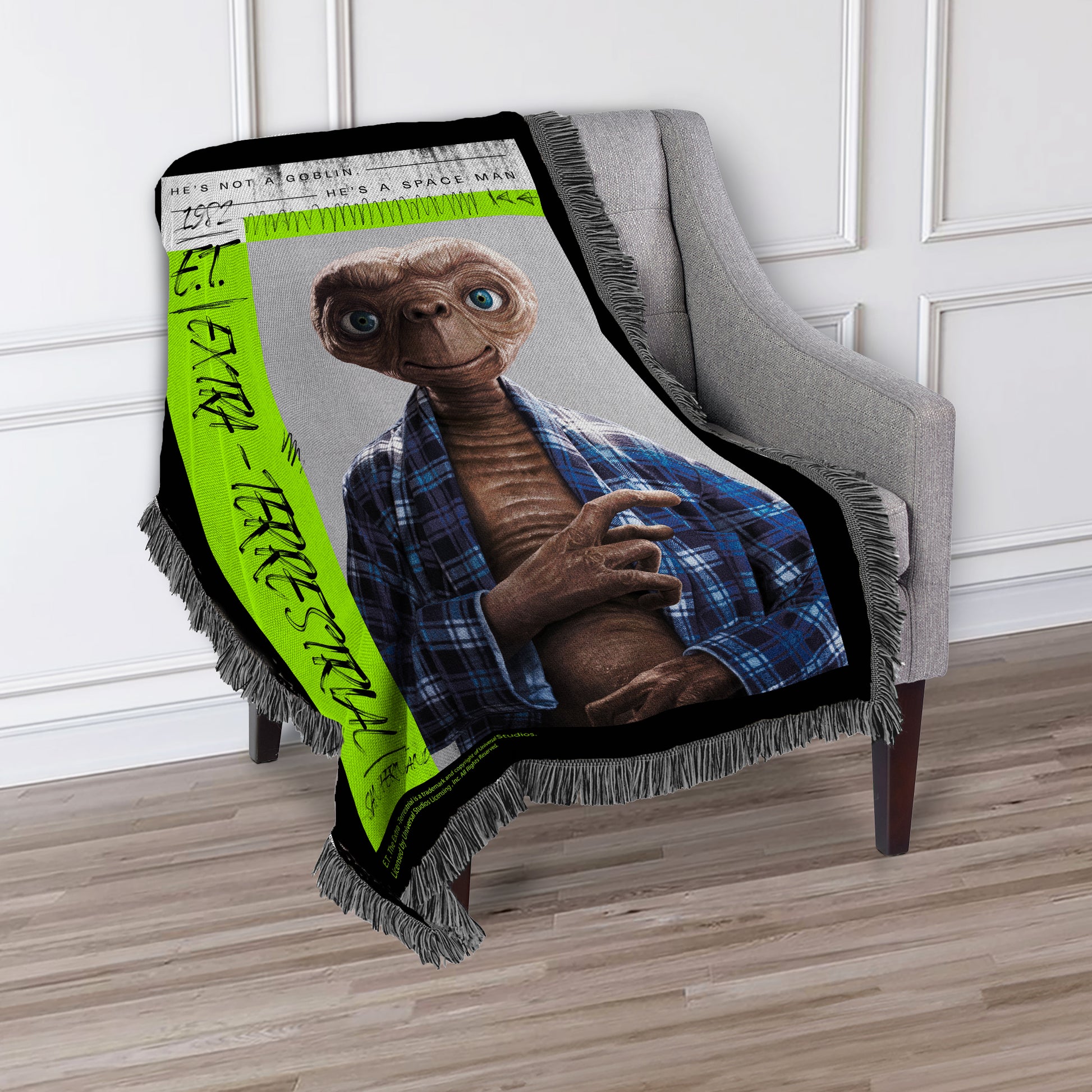 Celebrate out-of-this-world comfort with the officially licensed E.T. “He’s Not a Goblin” Tapestry Throw. Featuring a bold retro design and E.T. in his iconic plaid robe, this woven blanket is more than just a cozy layer—it’s a conversation starter and a nostalgic nod to one of cinema’s most beloved aliens. The eye-catching fringe adds a vintage touch while the soft, durable construction makes it ideal for everyday use. Drape it over your couch, bed, or favorite chair, or bring it along for movie marathons and outdoor stargazing. Whether you're wrapping up for warmth or displaying your love for this unforgettable classic, it’s a standout piece for any space—and a great gift idea for fans of all ages.