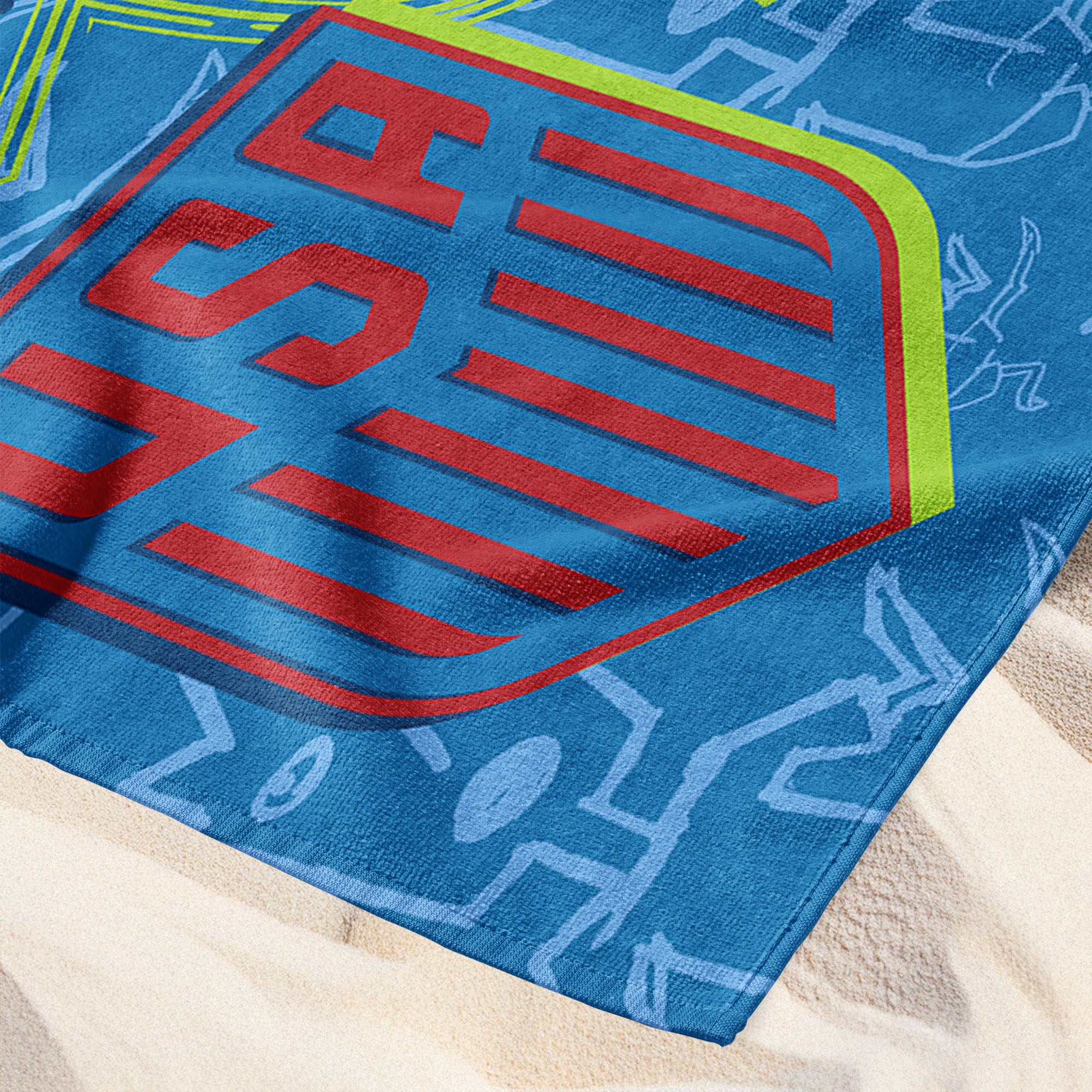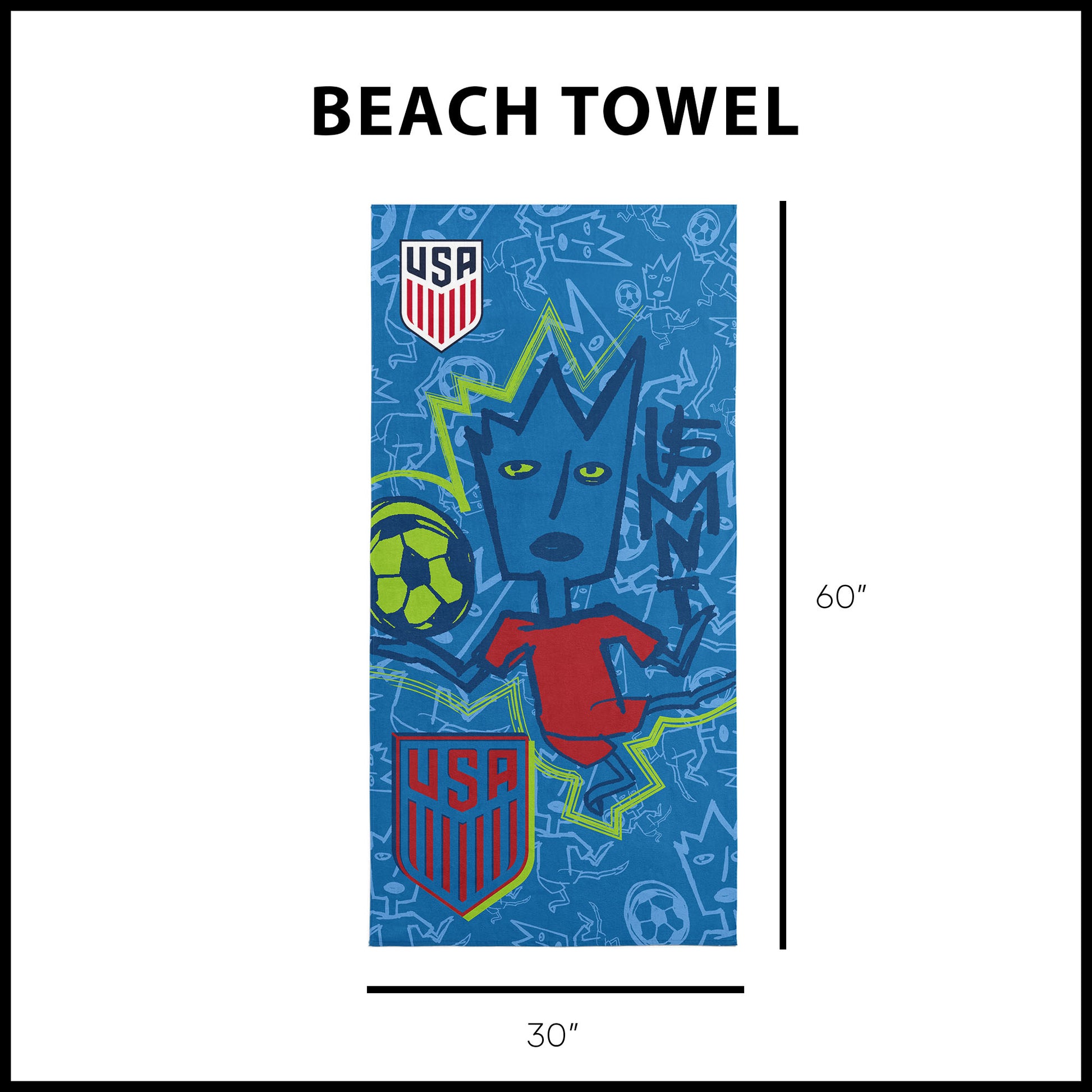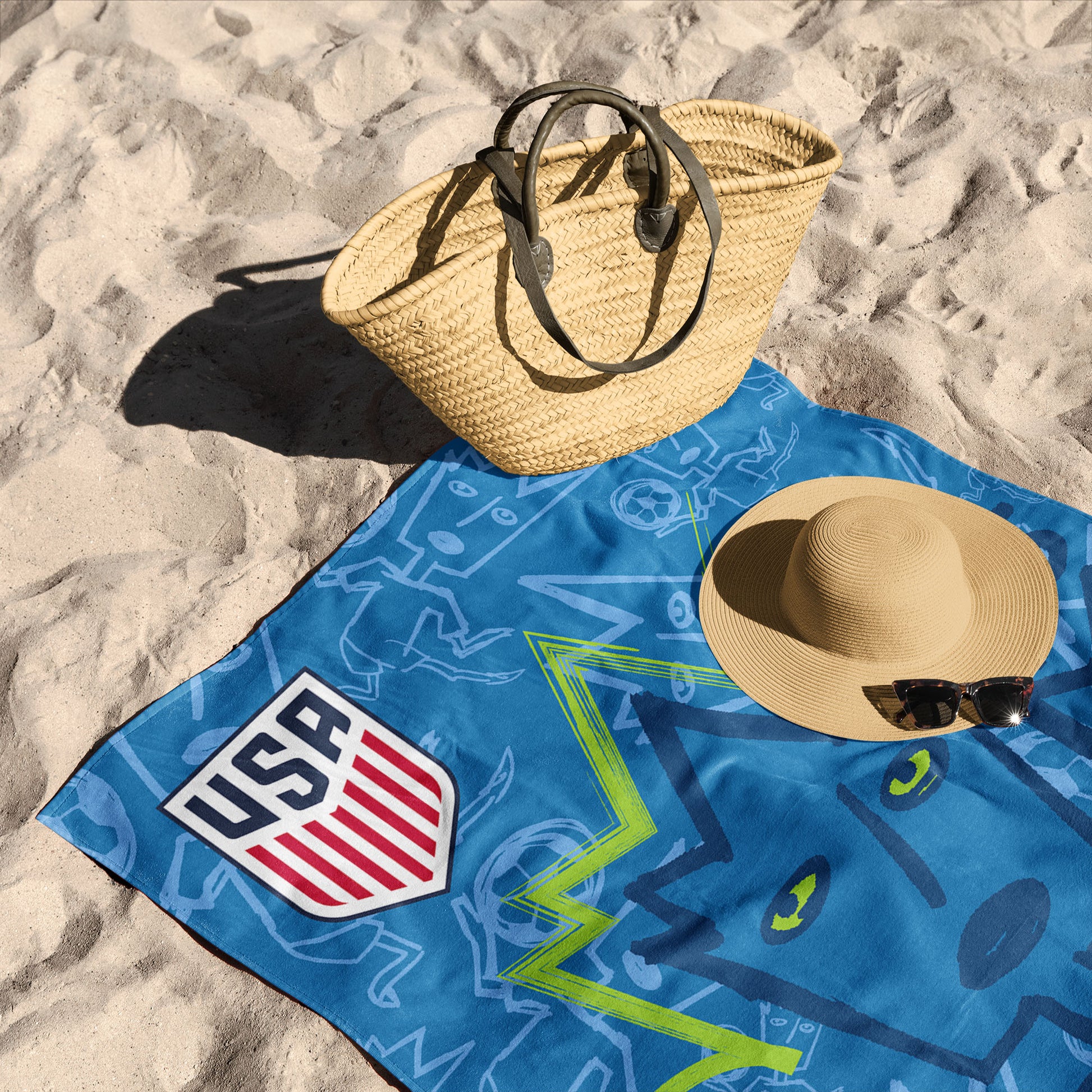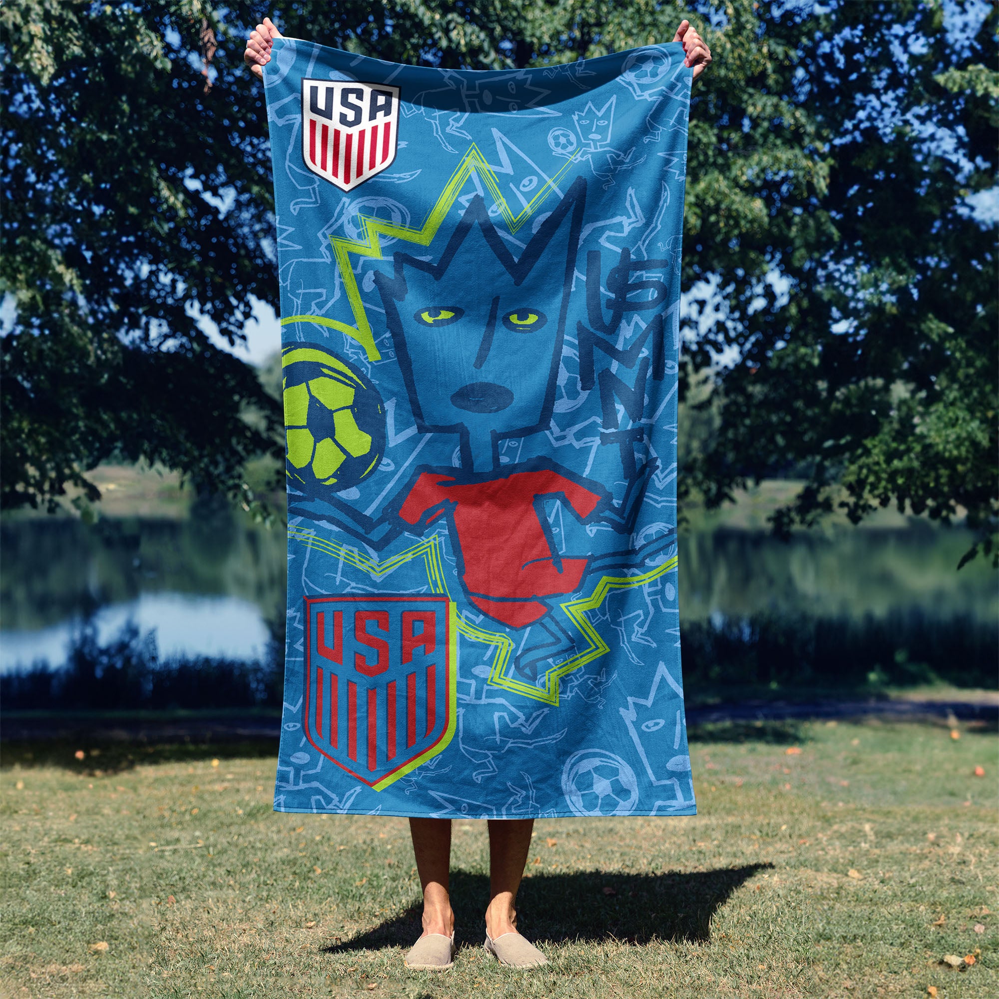 Energetic, artistic, and full of team pride, the Officially Licensed U.S. Soccer Balance Microfiber Beach Towel features a bold graffiti-style player graphic, dynamic sketchbook linework, and two prominent USA crest logos set against layered shades of blue. Made with soft, lightweight microfiber, it’s fast-drying, sand-resistant, and easy to pack for beach days, poolside lounging, or travel. A standout choice for soccer fans who love expressive, street-art-inspired style, offering cozy comfort and everyday durability. Makes a winning gift for anyone ready to rep U.S. Soccer all summer long.
