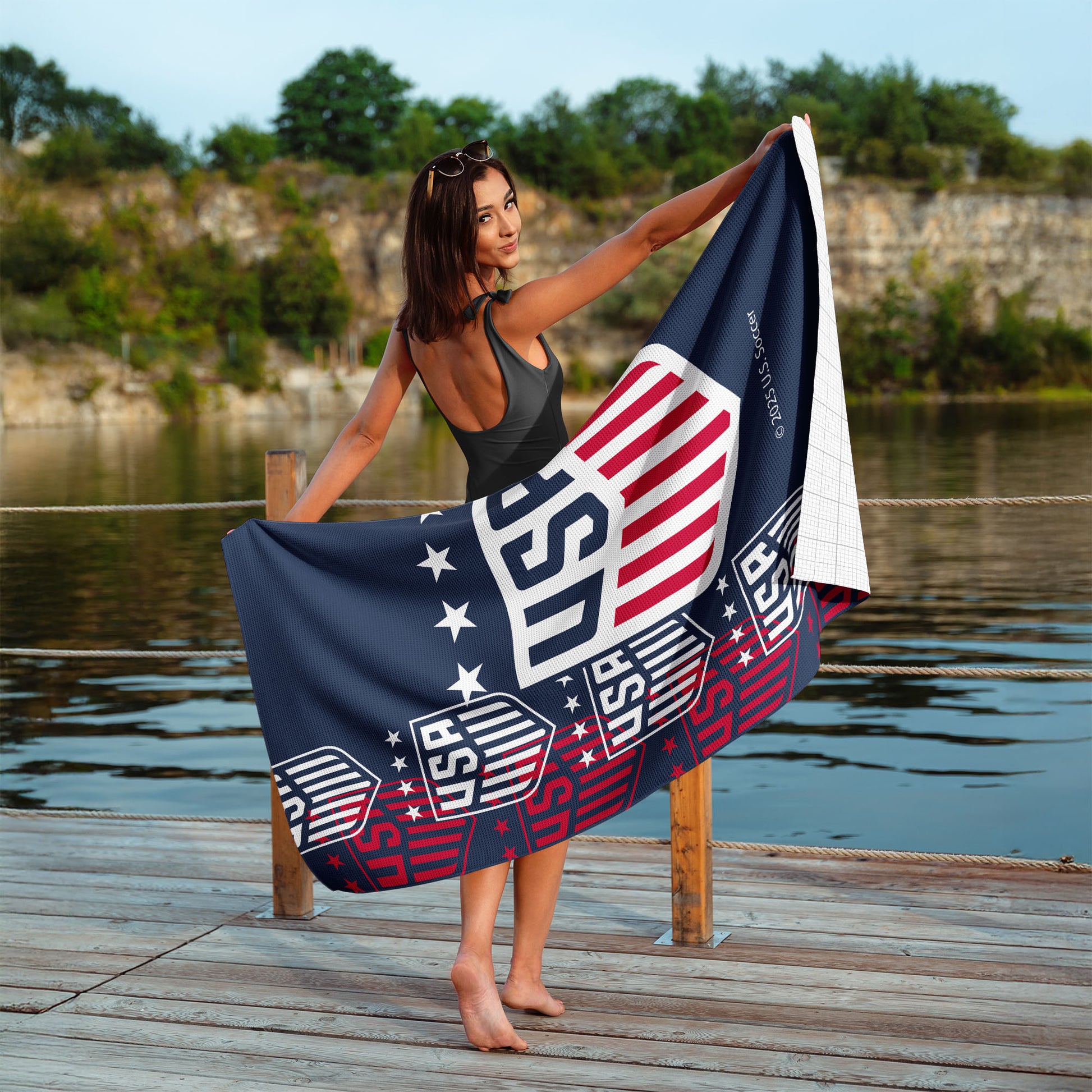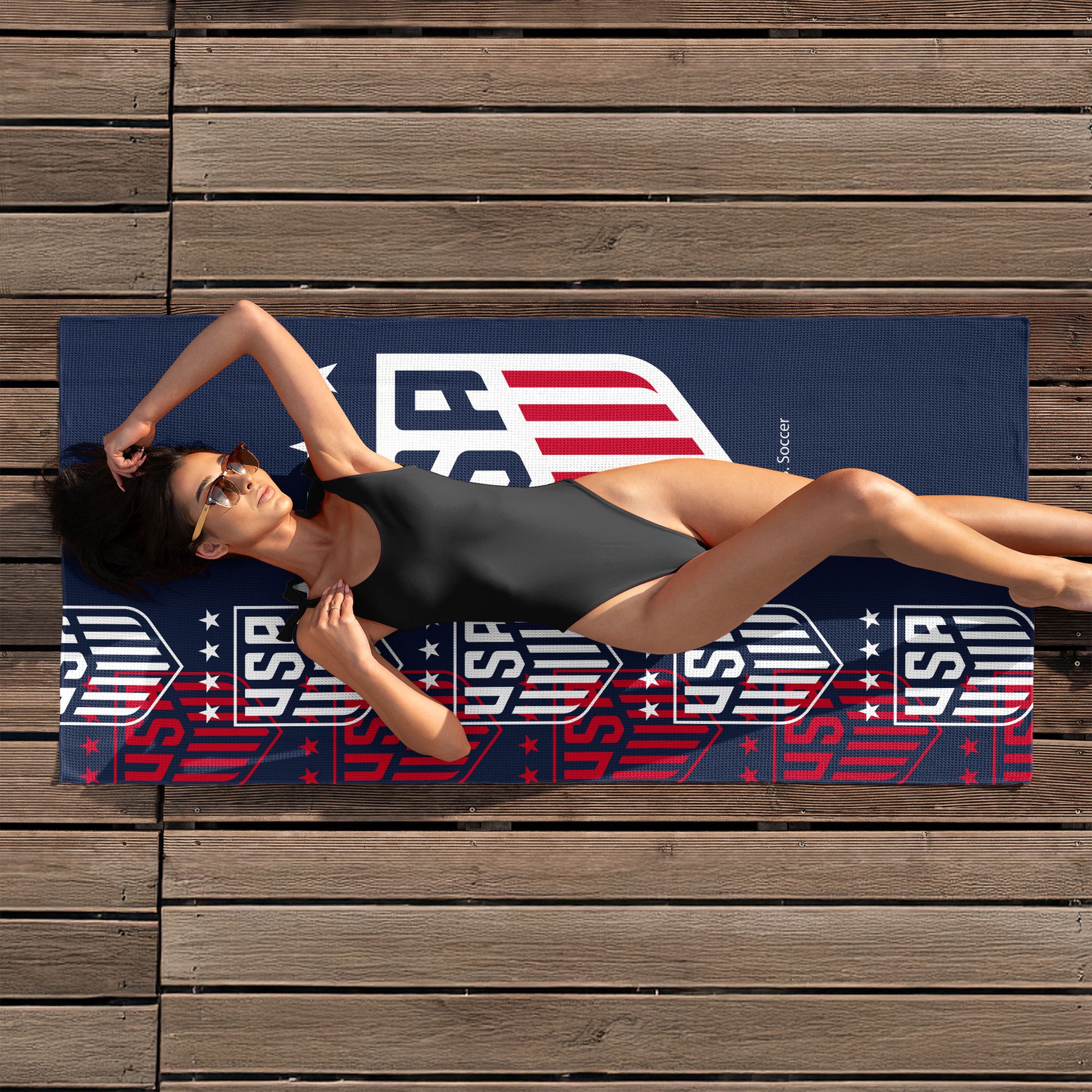 Proudly show your love for the red, white, and blue with the U.S. Soccer Mimic Womens Sand Free Waffle Weave Beach Towel — where style, strength, and spirit unite. Featuring the iconic U.S. Soccer crest topped with stars in a bold repeating design, this towel is crafted for both function and fandom. The sand-free waffle weave fabric keeps things smooth and light while repelling sand and drying quickly, making it perfect for beach days, poolside lounging, or post-practice relaxation. Its ultra-soft texture and durable construction ensure comfort and quality season after season. Officially Licensed by U.S. Soccer, this towel is the perfect gift for passionate fans who carry their team pride everywhere. Celebrate every sun-soaked moment with a towel that’s as strong, confident, and vibrant as the team it represents.