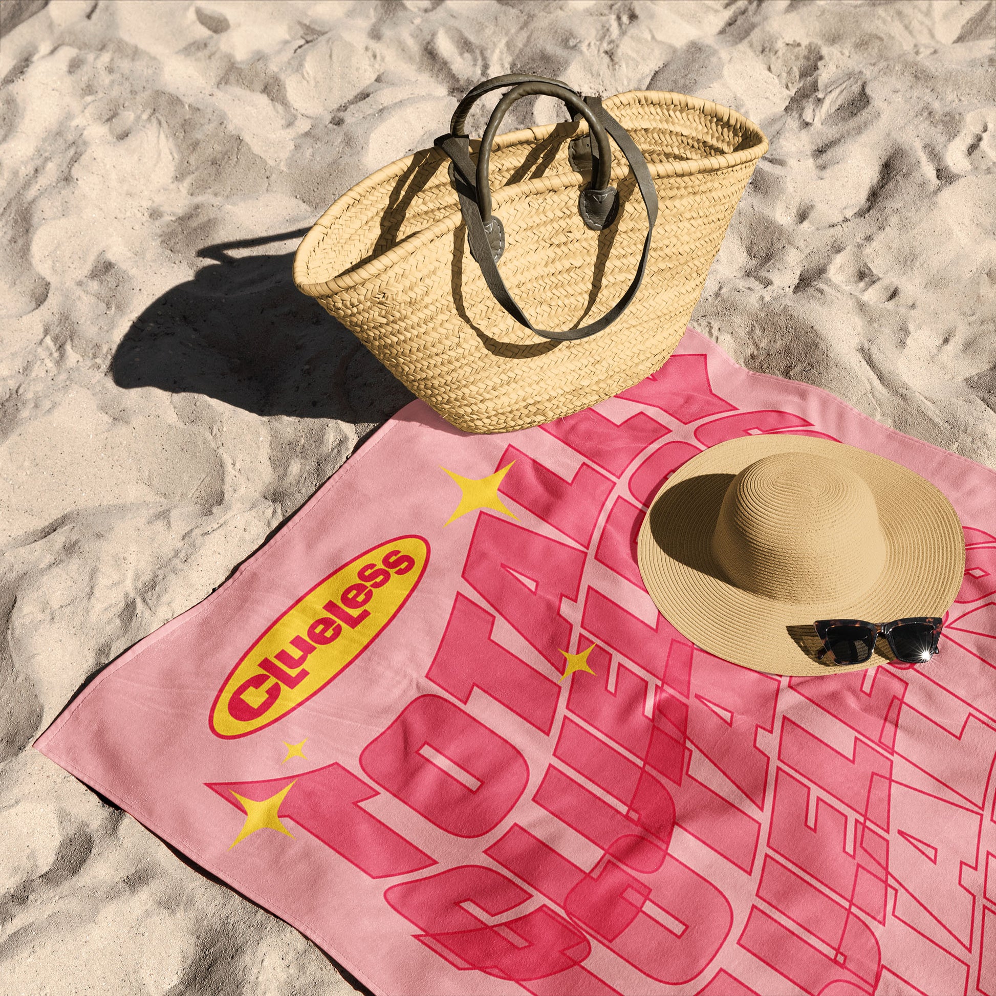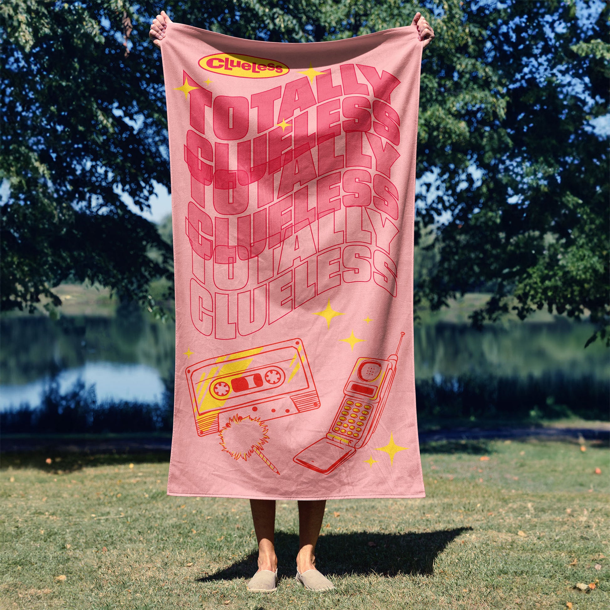 • Features stacked neon Totally Clueless lettering, sparkling accents, and retro icons like a cassette tape, flip phone, and fluffy pen.
