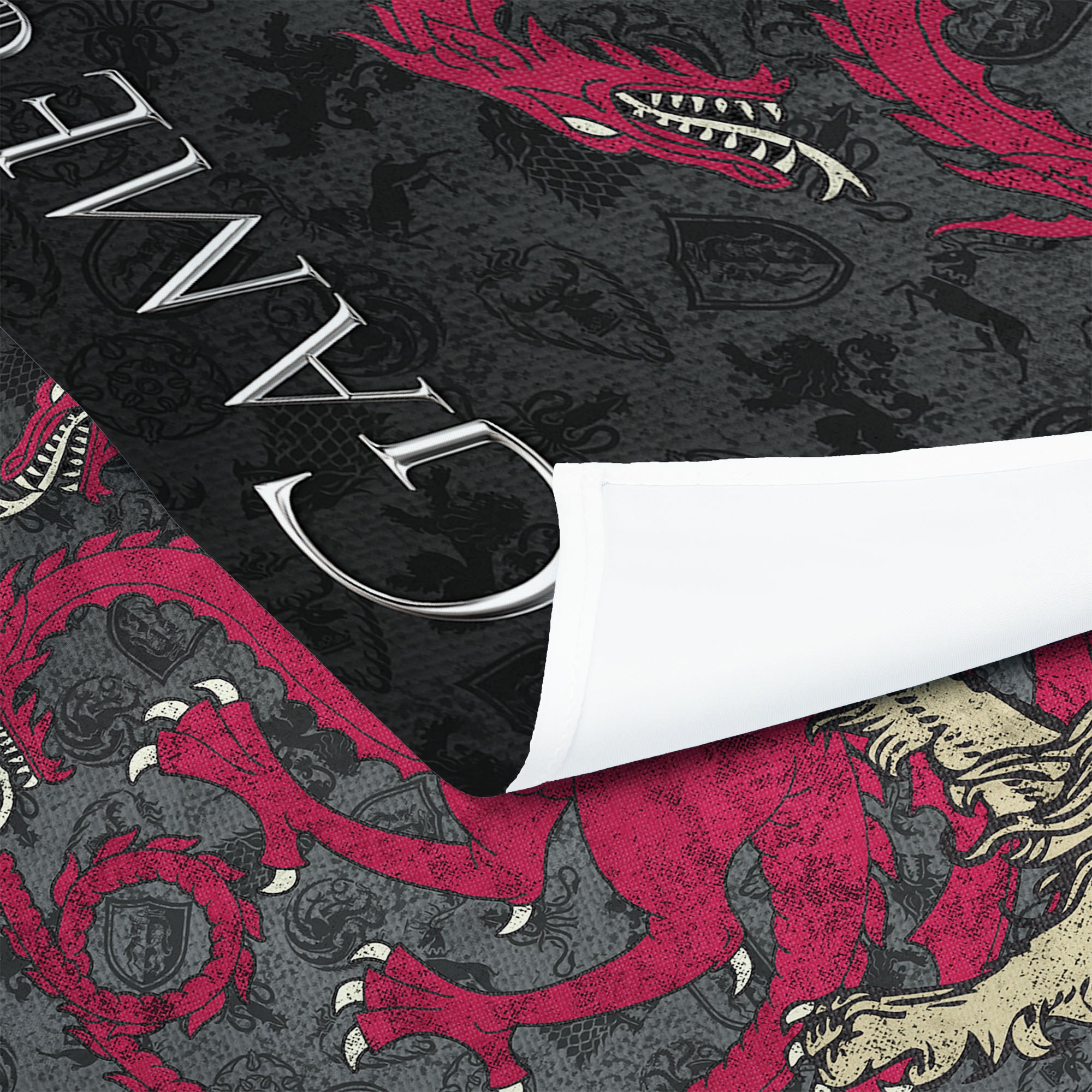 • Featuring the fierce emblems of House Targaryen, House Lannister, and House Stark set against a textured, battle-worn backdrop.