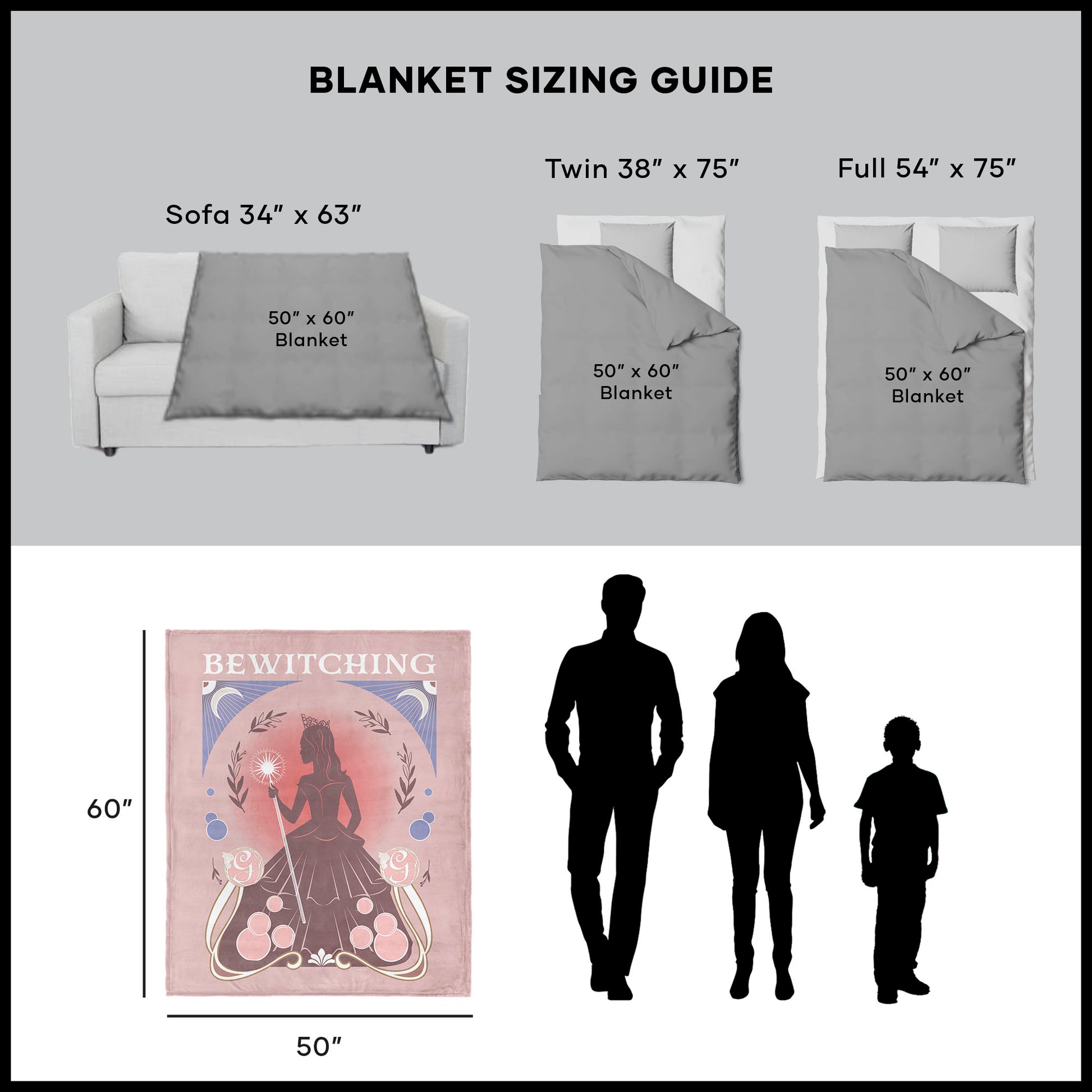 Enchant your space with the Universal Wicked “Bewitching” Silk Touch Sherpa Throw Blanket, featuring a magical silhouette of a crowned witch holding a glowing wand, surrounded by celestial moons, lush foliage, and whimsical bubble accents in soft blush and lavender tones. Inspired by the spellbinding world of Wicked, this blanket casts a cozy charm over any room, inviting you to dream of enchanted kingdoms, moonlit adventures, and fairytale moments that make every snuggle feel special. Draped over a bed, sofa, or reading nook, it becomes a bewitching accent piece that sparks the imagination and delights fans of all ages. Snuggle up in silky softness whether you’re rewatching your favorite witchy tale, hosting a themed movie night, or simply adding a dash of storybook magic to your everyday décor.